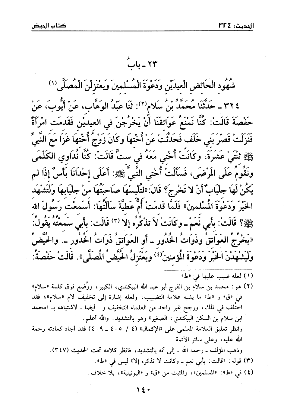324 - حدثنا محمد بنِ سلام: ثنا عبد الوهاب، عَن أيوب، عَن حفصة، قالت: كنا نمنع عواتقنا أن يخرجن في العيدين، فقدمت امرأة فنزلت قصر بني خلف، فحدثت عَن أختها - وكان زوج أختها غزا معَ النبي - صَلَّى اللهُ عَلَيْهِ وَسَلَّمَ - ثنتي عشرة، وكانت أختي معه في ست -، قالت: كنا نداوي الكلمى، ونقوم على المرضى، فسألت أختي النبي - صَلَّى اللهُ عَلَيْهِ وَسَلَّمَ -: أعلى إحدانا بأس إذا لَم يكن لها جلباب أن لا تخرج؟ قالَ: ((لتلبسها صاحبتها مِن جلبابها ولتشهد الخير ودعوة المسلمين)) . فلما قدمت أم عطية سألتها: أسمعت رسول الله - صَلَّى اللهُ عَلَيْهِ وَسَلَّمَ -؟ قالت: بأبا، نعم - وكانت لا تذكره إلا قالت: بأبي - سمعته يقول: ((يخرج العواتق وذوات الخدور - أو العواتق ذوات الخدور - والحيض، وليشهدن الخير ودعوة المؤمنين، ويعتزل الحيض المصلى)) .