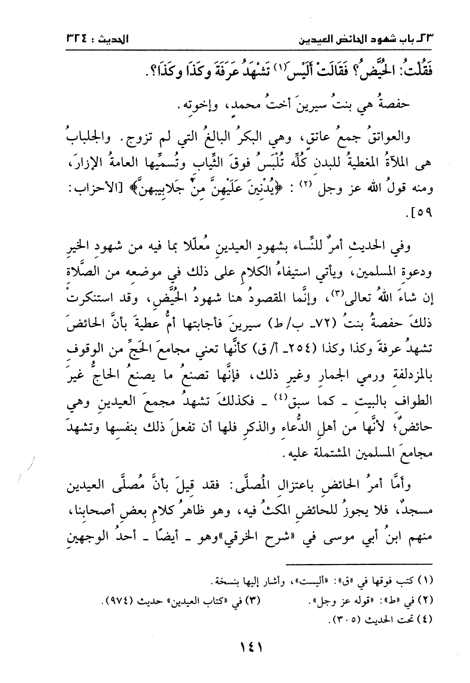 وإنما المقصود هنا: شهود الحيض، وقد استنكرت ذَلِكَ حفصة بنت سيرين، فأجابتها أم عطية بأن الحائض تشهد عرفة وكذا وكذا، كأنها تعني: مجامع الحج مِن الوقوف بالمزدلفة، ورمي الجمار وغير ذَلِكَ، فإنها تصنع ما يصنع الحاج غير الطواف بالبيت، كَما سبق، فكذلك تشهد مجمع العيدين وهي حائض؛ لأنها مِن أهل الدعاء والذكر، فلها أن تفعل ذَلِكَ بنفسها، وتشهد مجامع المسلمين المشتملة عليهِ.