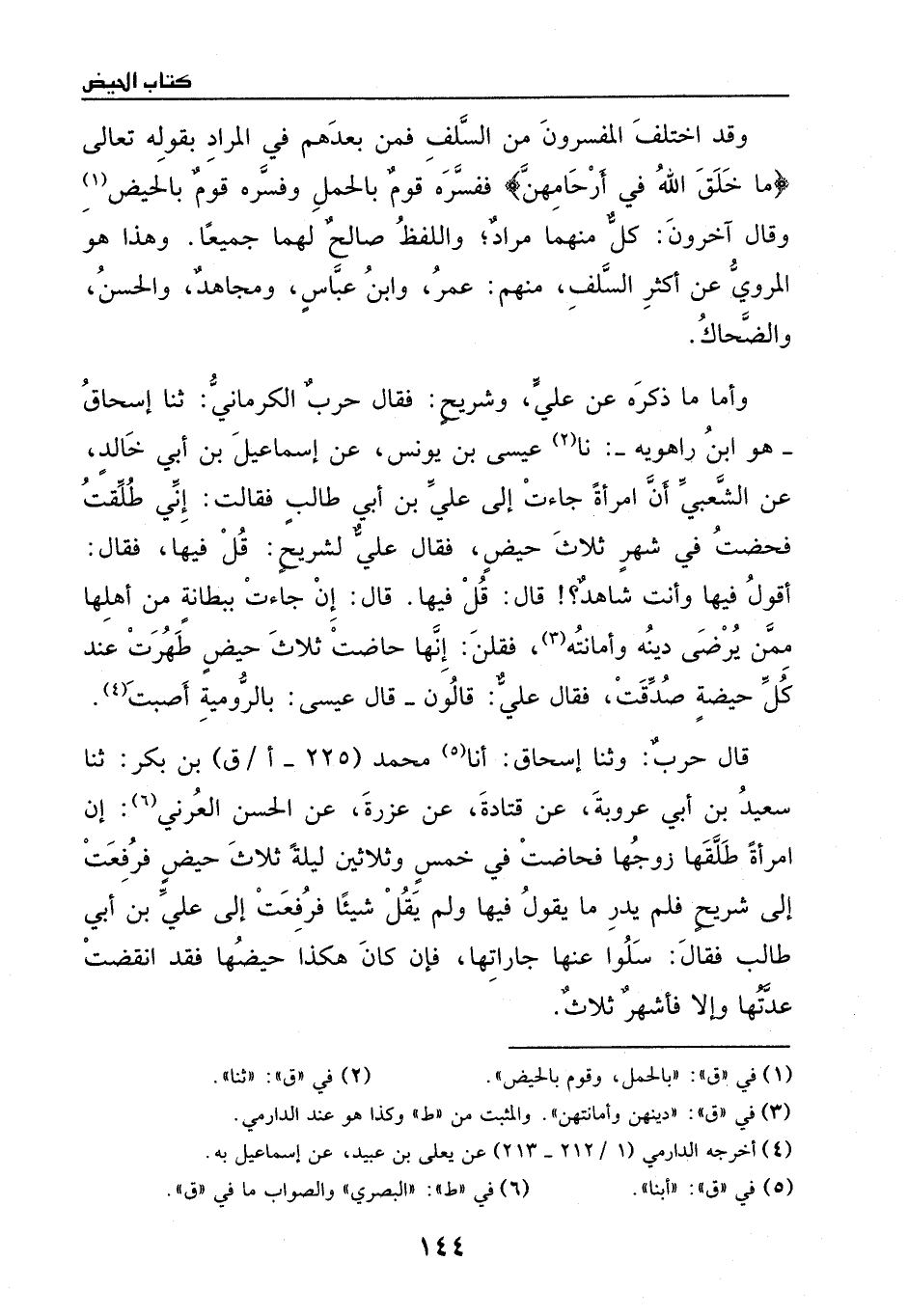قالَ حرب: وثنا إسحاق: أبنا محمد بن بكر: ثنا سعيد بن أبي عروبة، عَن قتادة، عَن عزرة، عَن الحسن العرني، أن امرأة طلقها زوجها، فحاضت في خمس وثلاثين ليلة ثلاث حيض، فرفعت إلى شريح فلم يدر ما يقول فيها، ولم يقل شيئاً، فرفعت إلى علي بن أبي طالب، فقالَ: سلوا عنها جاراتها، فإن كانَ هكذا حيضها فَقد انقضت عدتها، وإلا فأشهر ثلاث.