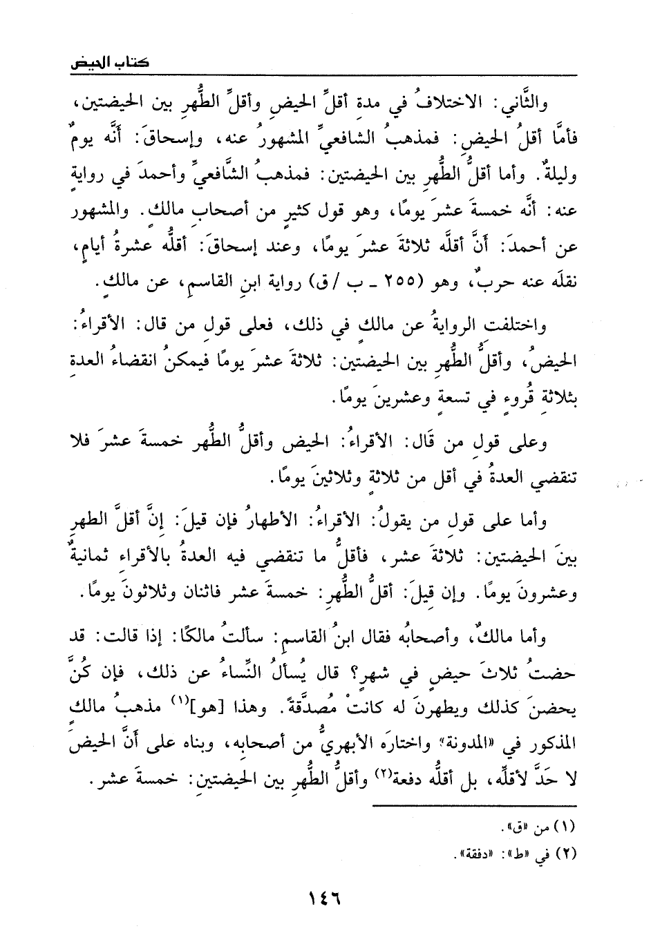 وأما أقل الطهر بين الحيضتين: فمذهب الشافعي وأحمد - في رواية عَنهُ -: أنَّهُ خمسة عشر يوماً، وَهوَ قول كثير مِن أصحاب مالك.