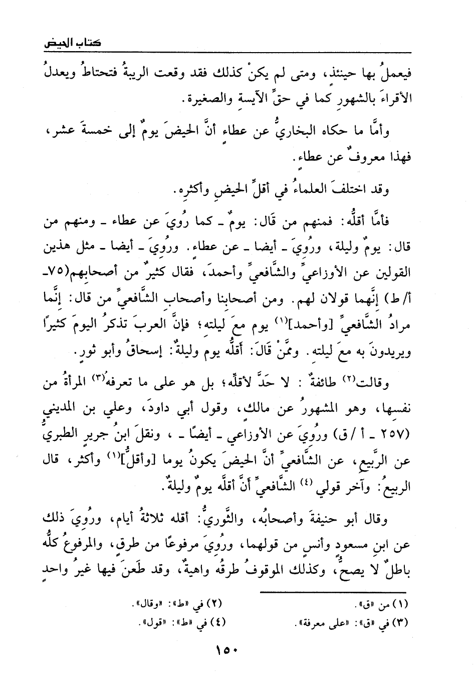 وقالت طائفة: لا حد لأقله، بل هوَ على ما تعرفه المرأة مِن نفسها، وَهوَ المشهور عَن مالك، وقول أبي داود وعلي بنِ المديني، وروي عَن الأوزاعي - أيضاً.