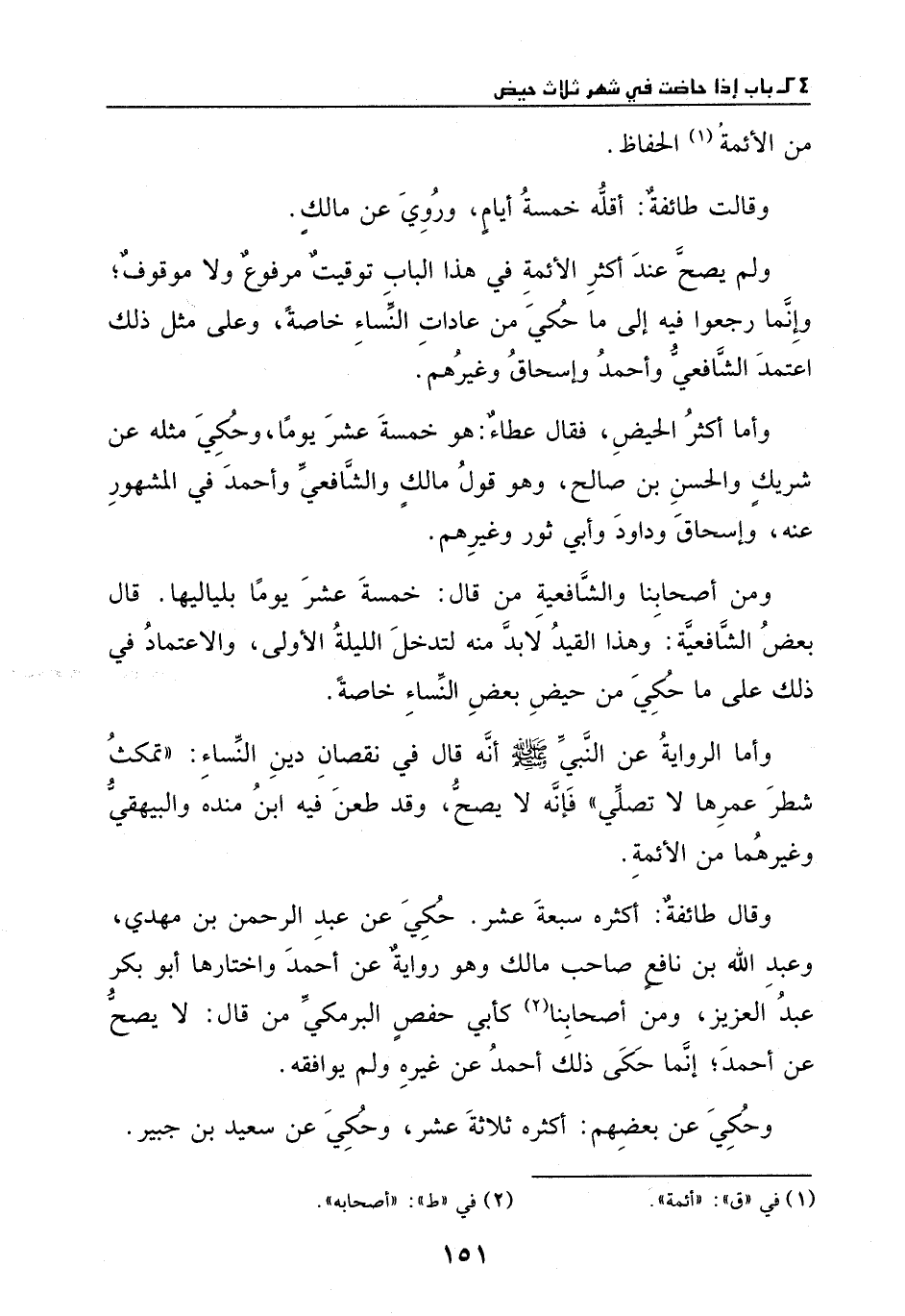 ولم يصح عند أكثر الأئمة في هَذا الباب توقيت مرفوع ولا موقوف، وإنما رجعوا فيهِ إلى ما حكي مِن عادات النساء خاصة، وعلى مثل ذَلِكَ اعتمد الشافعي وأحمد وإسحاق وغيرهم.