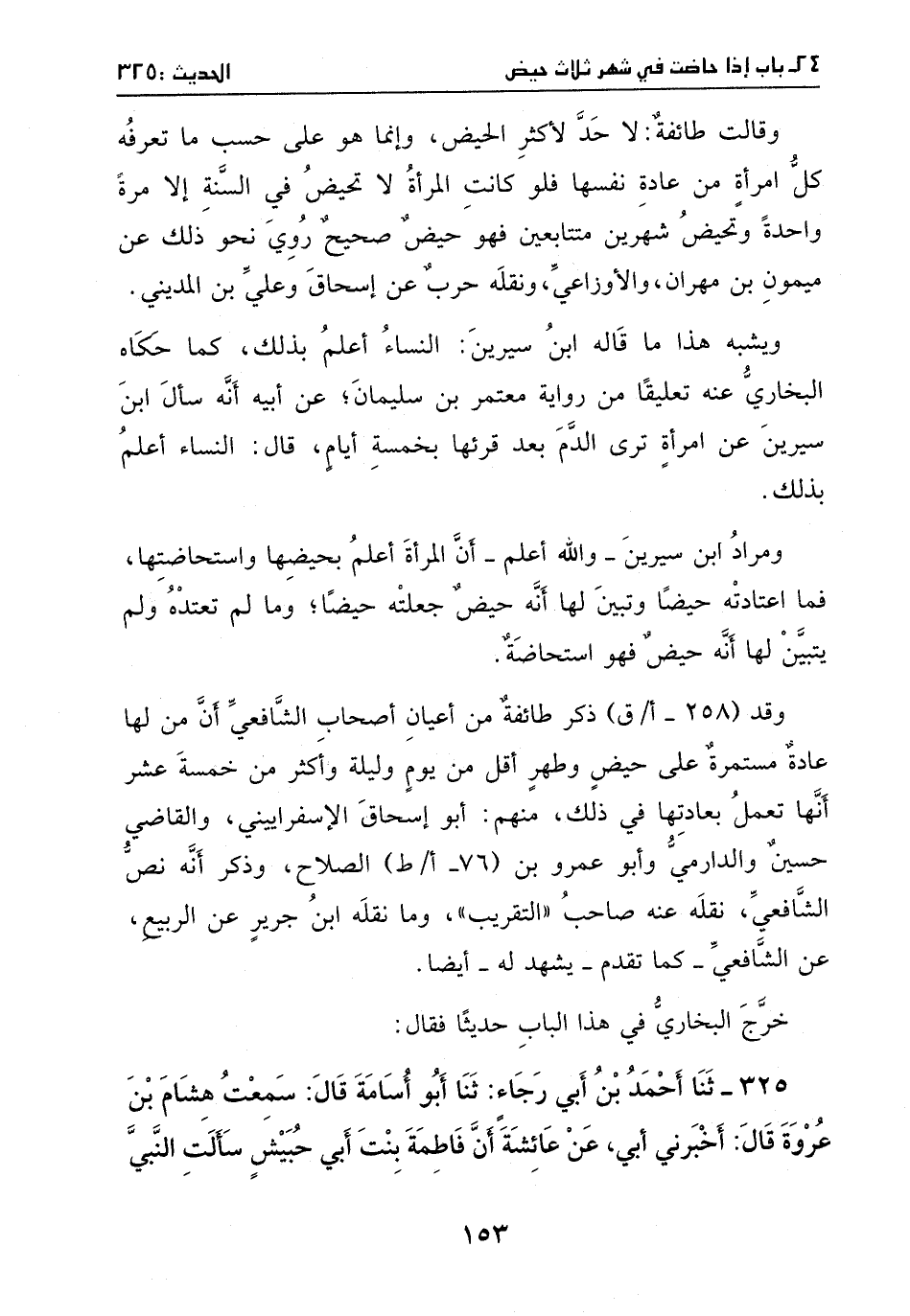 325 - ثنا أحمد بنِ أبي رجاء: ثنا أبو أسامة، قالَ: سمعت هشام بنِ عروة، قالَ: أخبرني أبي، عَن عائشة، أن فاطمة بنت أبي حبيش سألت النبي - صَلَّى اللهُ عَلَيْهِ وَسَلَّمَ -،