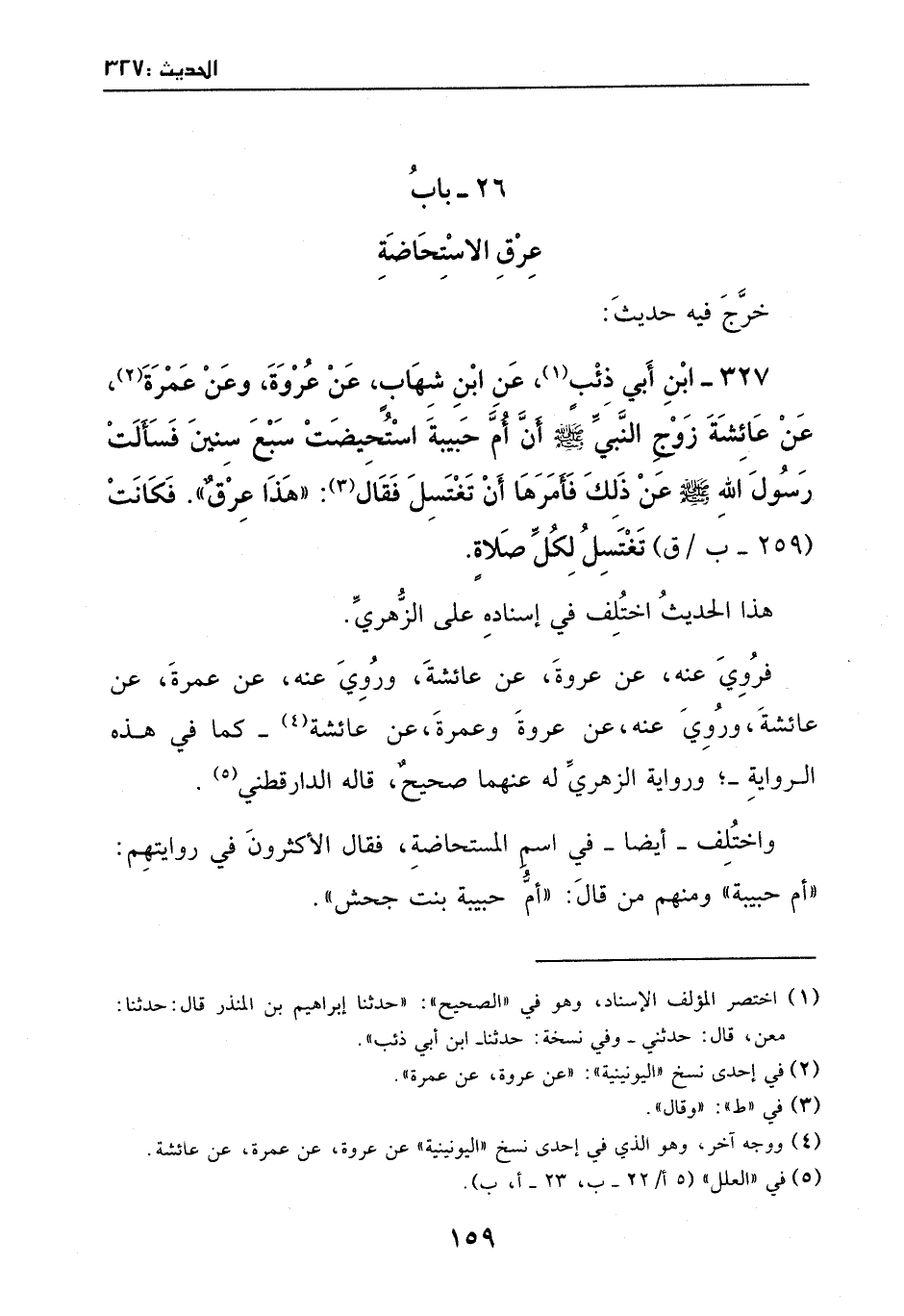 327 - حديث: ابن أبي ذئب، عَن ابن شهاب، عَن عروة - وعن عمرة -، عَن عائشة زوج النبي - صَلَّى اللهُ عَلَيْهِ وَسَلَّمَ -، أن أم حبيبة استحيضت سبع سنينَ، فسألت رسول الله - صَلَّى اللهُ عَلَيْهِ وَسَلَّمَ - عَن ذَلِكَ، فأمرها أن تغتسل، فقالَ: ((هَذا عرق)) ، فكانت تغتسل لكل صلاة.