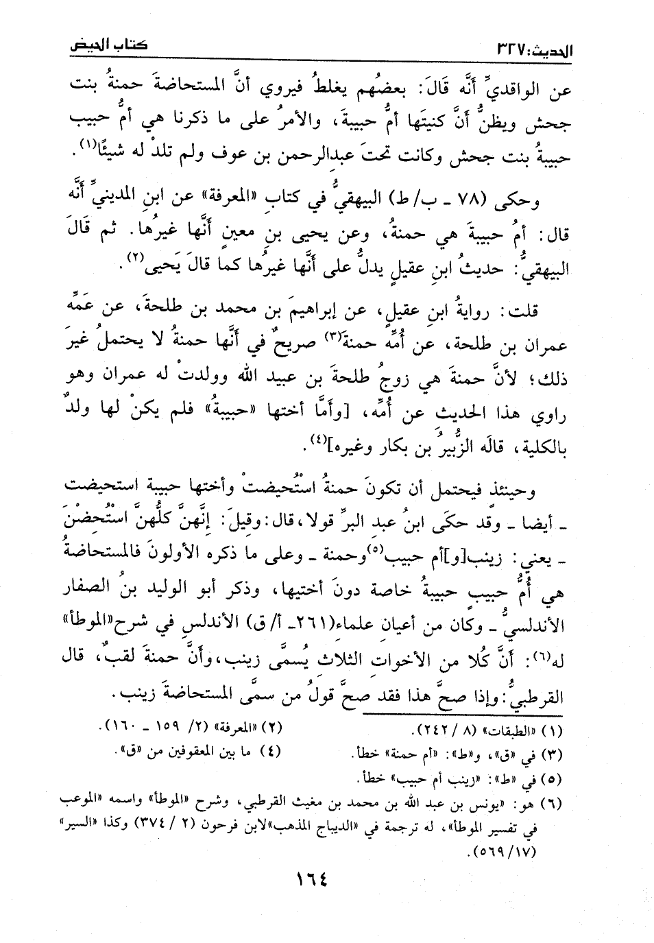 قلت: رواية ابن عقيل، عَن ابن إبراهيم بنِ محمد بنِ طلحة، عَن عمه عمران بن طلحة، عَن أمه حمنة صريح في أنها حمنة لا تحتمل غير ذَلِكَ؛ لأن حمنة هي زوج طلحة بنِ عبيد الله، وولدت لَهُ عمران، وَهوَ رواي هَذا الحديث عَن أمه، [وأما أختها حبيب فلم يكن لها ولد بالكلية -: قاله الزبير بنِ بكار وغيره] ، وحينئذ فيحتمل أن تكون حمنة استحيضت، وأختها حبيبة استحيضت - أيضاً.