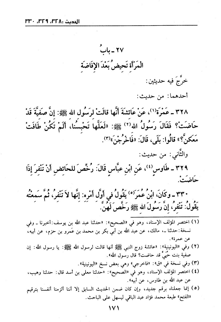 328 - مِن حديث: عمرة، عَن عائشة، أنها قالت لرسول الله - صَلَّى اللهُ عَلَيْهِ وَسَلَّمَ -: إن صفية قَد حاضت، فقالَ رسول الله - صَلَّى اللهُ عَلَيْهِ وَسَلَّمَ -: ((لعلها تحبسنا، ألم تكن طافت معكن؟)) قالوا: بلى. قالَ: ((فاخرجي)) .