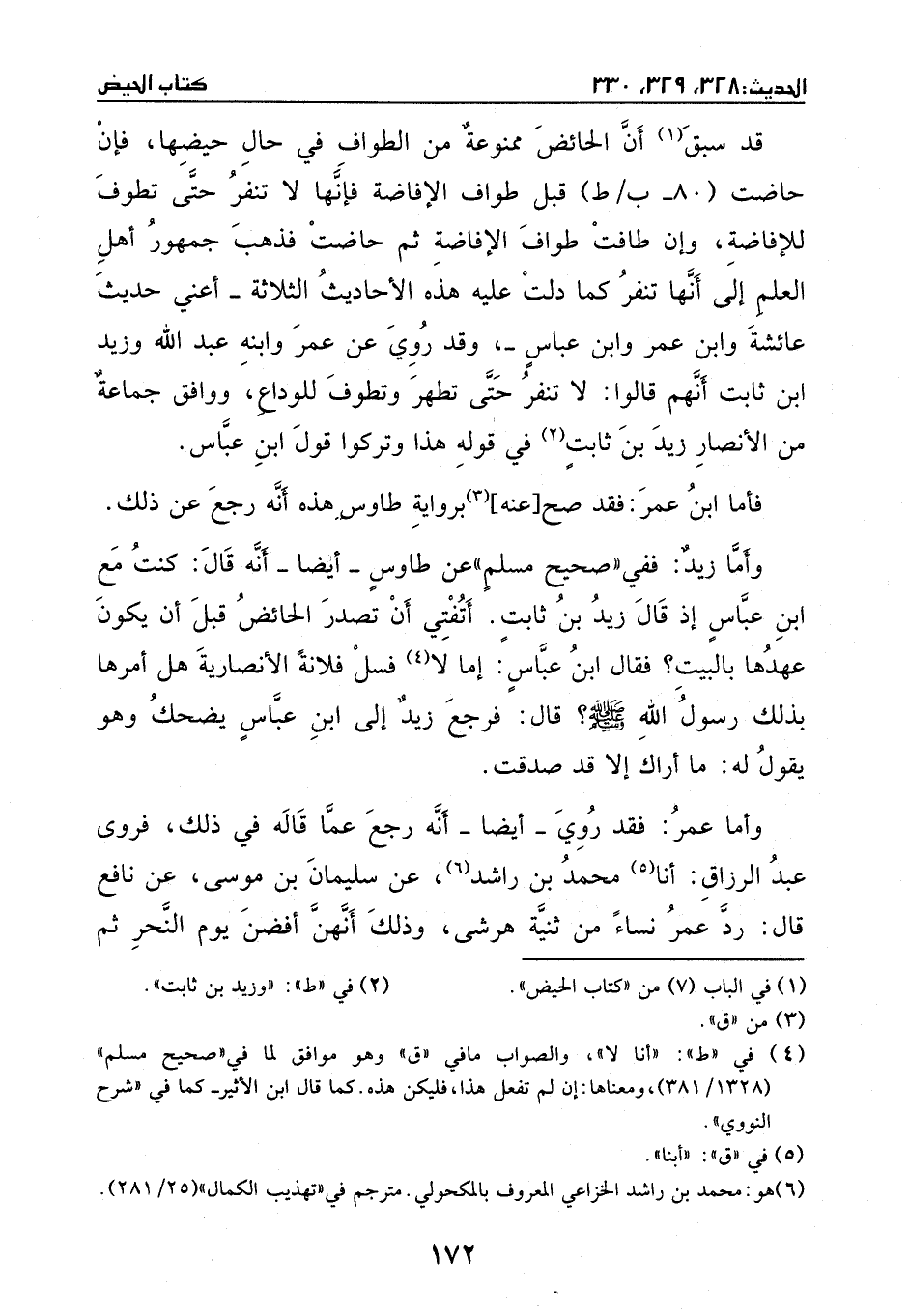 وقد روي عَن عمر، وابنه عبد الله، وزيد بنِ ثابت، أنهم قالوا: لا تنفر حتى تطهر، وتطوف للوداع. ووافق جماعة مِن الأنصار زيد بنِ ثابت في قولُهُ هَذا، وتركوا قول ابن عباس.