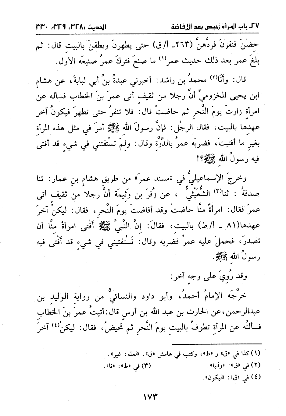 النحر، ثُمَّ حاضت؟ قالَ: فلا تنفر حتى تطهر، فيكون آخر عهدها بالبيت، فقالَ الرجل: فإن رسول الله - صَلَّى اللهُ عَلَيْهِ وَسَلَّمَ - أمر في مثل هَذهِ المرأة بغير ما أفتيت، فضربه عمر بالدرة، وقال: ولم تستفتني في شيء قَد أفتى فيهِ رسول الله - صَلَّى اللهُ عَلَيْهِ وَسَلَّمَ -؟ !
