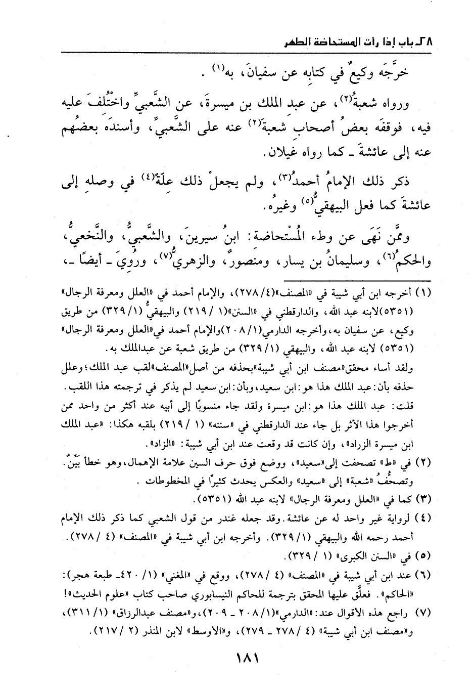 ورواه [شعبة] ، عن عبد الملك بن ميسرة، عن الشعبي، واختلف عليهِ فيهِ، فوقفه بعض أصحاب شعبة، عنه على الشعبي، وأسنده بعضهم عنه إلى عائشة كما رواه غيلان -: ذكر ذَلِكَ الإمام أحمد، ولم يجعل ذَلِكَ علة في وصله إلى عائشة، كما فعل البيهقي وغيره.