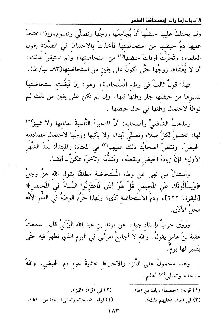 واستدل من نهى عن وطء المستحاضة مطلقاً بقول الله عز وجل: {وَيَسْأَلونَكَ عَنِ الْمَحِيضِ قُلْ هُوَ أَذىً فَاعْتَزِلُوا النِّسَاءَ فِي الْمَحِيضِ} [البقرة: 222] ودم الاستحاضة أذى؛ ولهذا حرم الوطء في الدبر؛ لأنه محل الأذى.