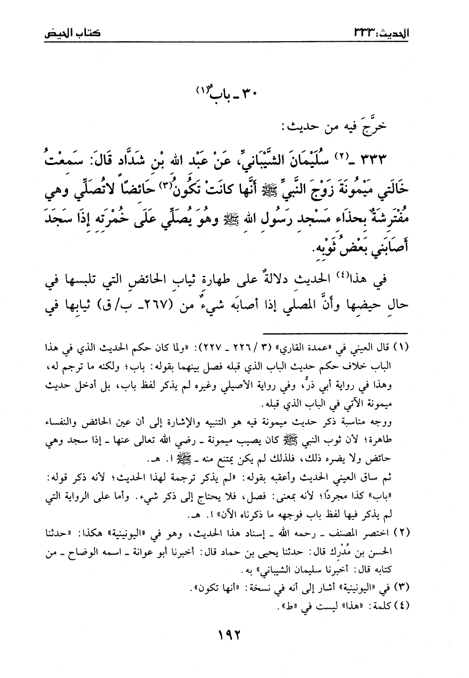 333 - من حديث: سليمان الشيباني، عن عبد الله بن شداد، قالَ: سمعت خالتي ميمونة زوج النبي - صَلَّى اللهُ عَلَيْهِ وَسَلَّمَ -، أنها كانت تكون حائضاً لا تصلي، وهي مفترشة بحذاء مسجد رسول الله - صَلَّى اللهُ عَلَيْهِ وَسَلَّمَ -، وهو يصلي على خمرتة، إذا سجد أصابني بعض ثوبه.