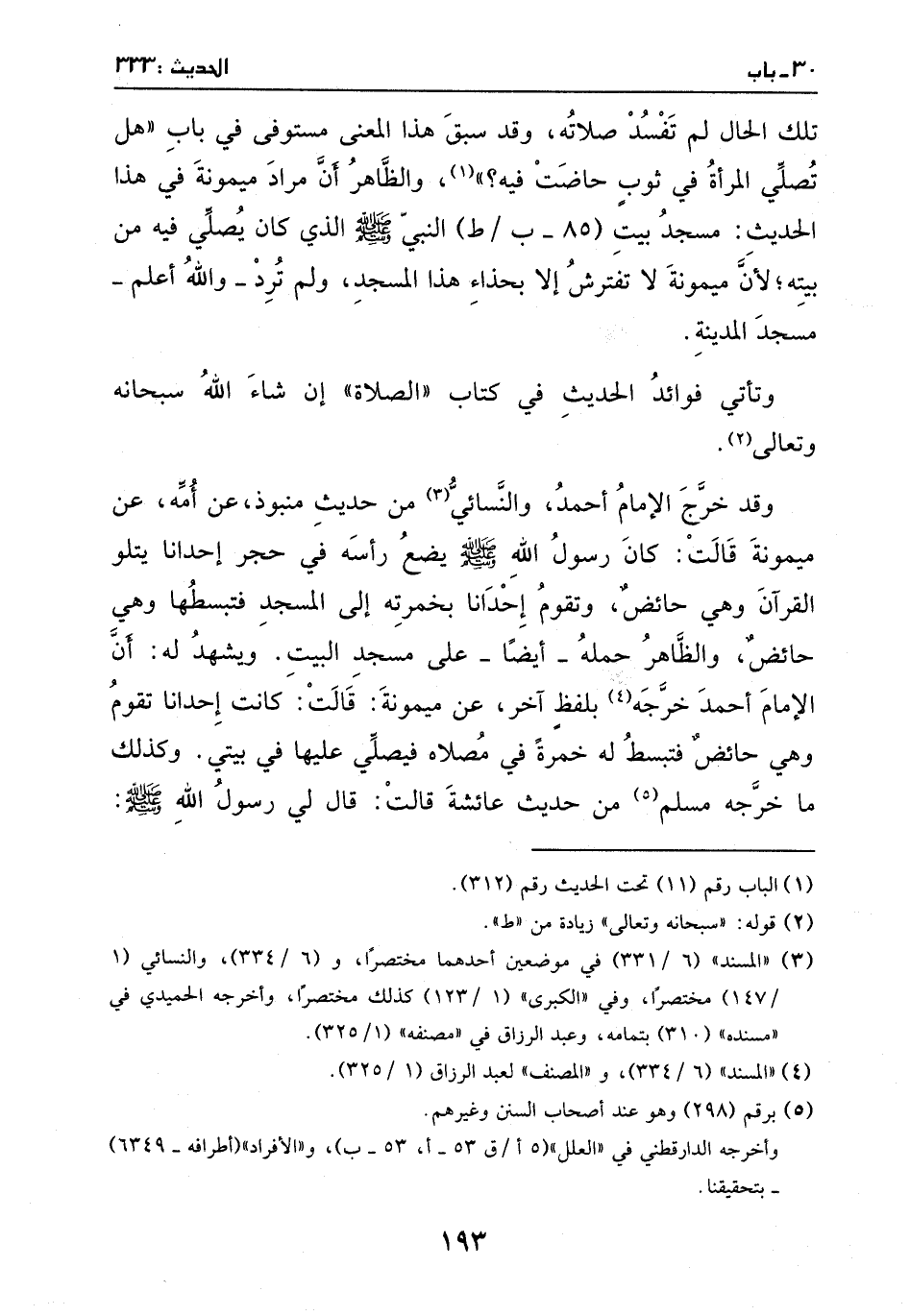ويشهد لهُ: أن الإمام أحمد خرجه بلفظ آخر، عن ميمونة، قالت: كانت إحدانا تقوم وهي حائض فتبسط لهُ خمرةً في مصلاه، فيصلي عليها في بيتي.