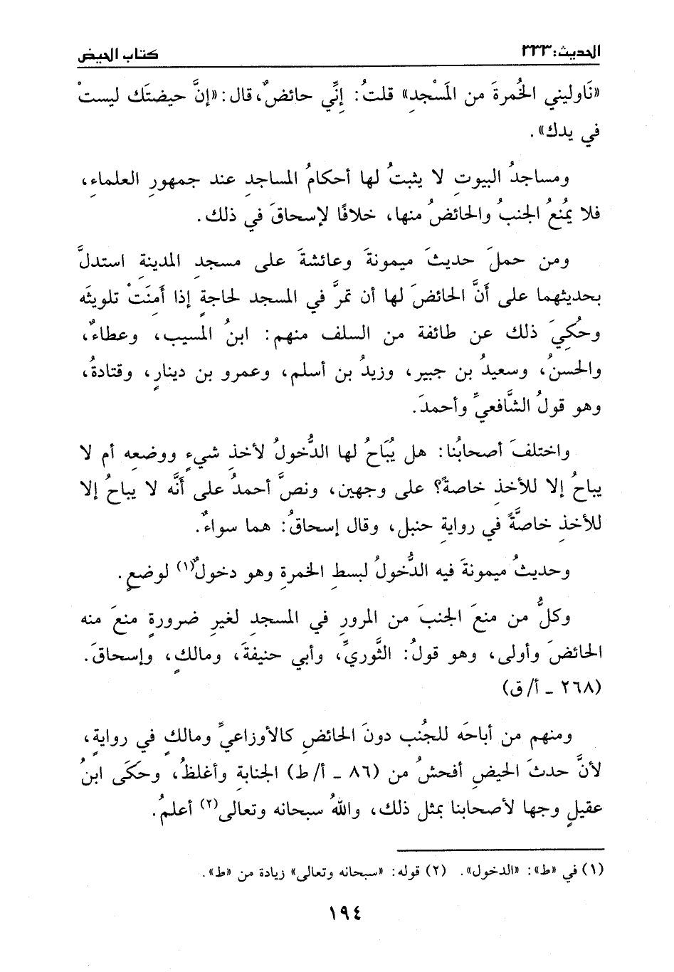 ومنهم: من أباحه للجنب دون الحائض، كالأوزاعي، ومالك في رواية؛ لأن حدث الحيض أفحش من الجنابة وأغلظ، وحكى ابن عقيل وجهاً لأصحابنا بمثل ذَلِكَ. والله سبحانه وتعالى أعلم.