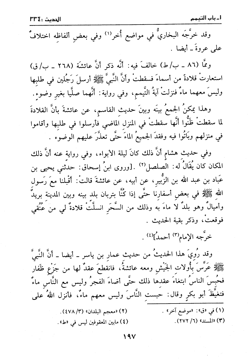 وهذا يمكن الجميع بينه وبين حديث القاسم، عن عائشة بان القلادة لما سقطت ظنوا أنها سقطت في المنزل الماضي، فأرسلوا في طلبها وأقاموا في منزلهم وباتوا فيه، وفقد الجميع الماء حتى تعذر عليهم الوضوء.