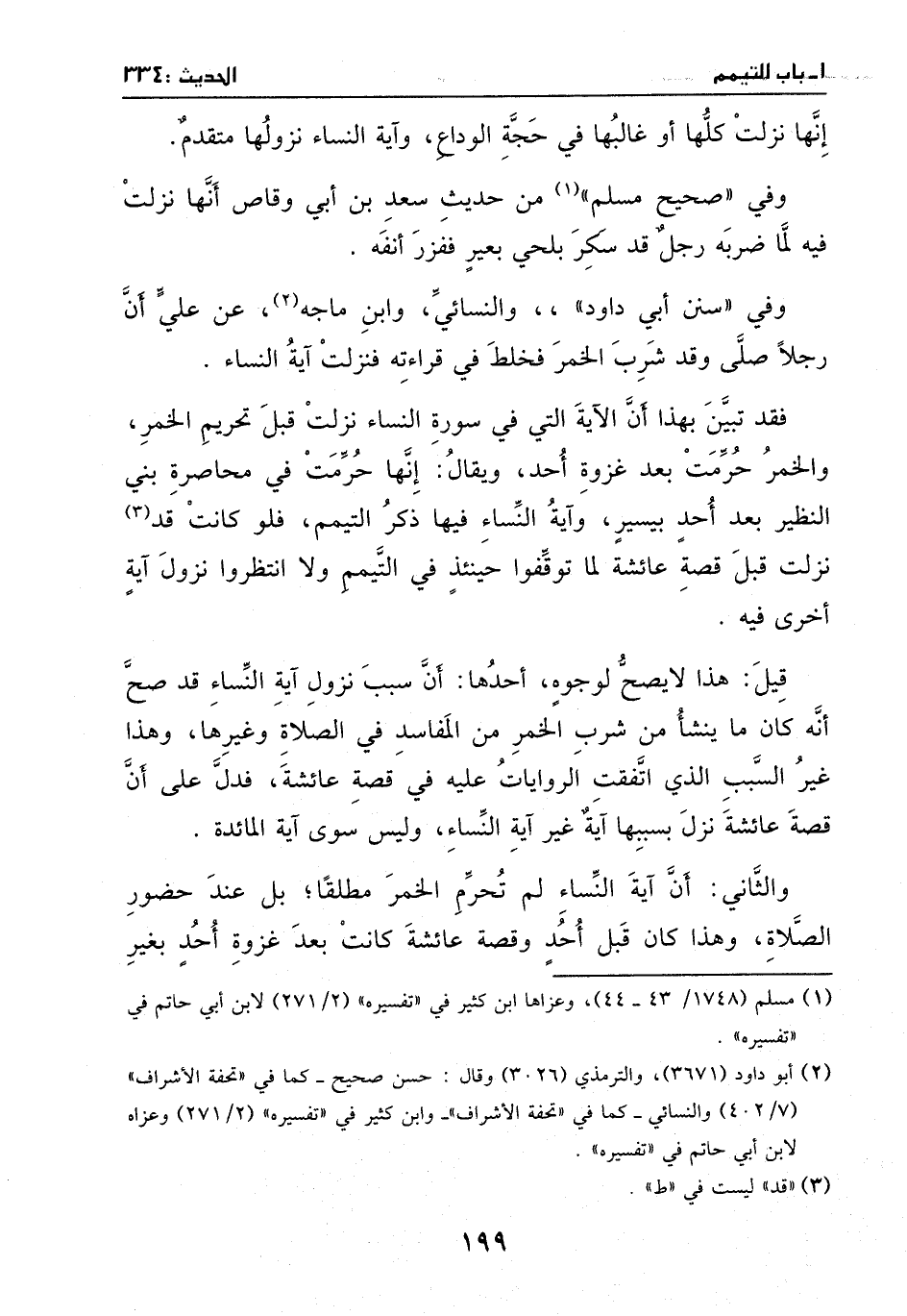 أحدها: سبب نزول آية النساء قد صح أنه كان ما ينشأ من شرب الخمر من المفاسد في الصلاة وغيرها، وهذا غير السبب الذي أتففت الروايات عليه في قصة عائشة، فدلّ على أن قصة عائشة نزل بسببها آية غير آية النساء، وليس سوى آية المائدة.