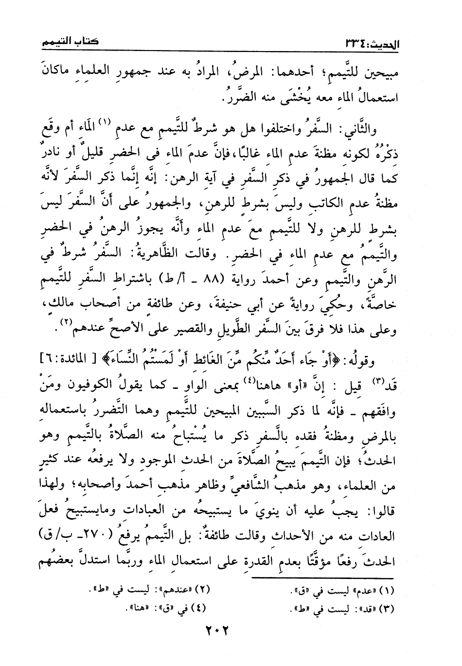 والثاني: السفر، واختلفوا: هل هو شرط للتيمم مع (عدم) الماء، أم وقع ذكره لكونه مظنة عدم الماء غالباً، فإن عدم الماء في الحضر قليل أو نادر، كما قال الجمهور في ذكر السفر في آية الرهن، أنة إنما ذكر السفر لأنه مظنة عدم الكاتب، وليس بشرط للرهن.