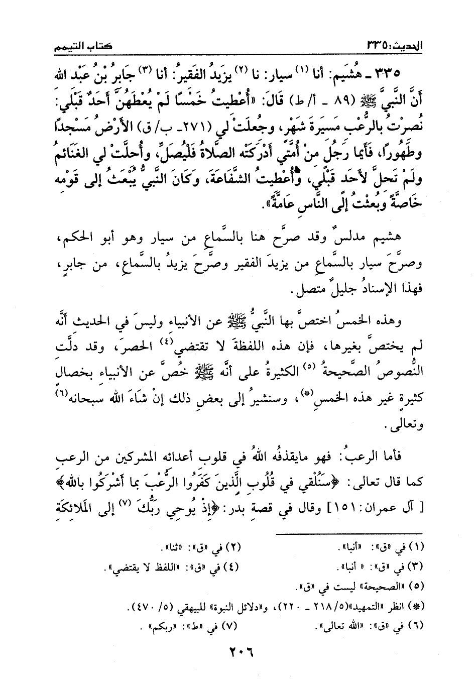 هشيم: أبنا سيارٌ: ثنا يزيد الفقير: أبنا جابر بن عبد الله، أن النبي - صَلَّى اللهُ عَلَيْهِ وَسَلَّمَ - قَالَ: ((أعطيت خمساً لم يعطهن أحدٌ قبلي: نصرت بالرعب مسيرة شهر، وجعلت لي الأرض مسجدا وطهورا، فأيما رجل من أمتي أدركته الصَّلاة فليصل، وأحلت لي الغنائم ولم تحل لأحد قبلي، وأعطيت الشفاعة، وكان النبي يبعث إلى قومه خاصة وبعثت إلى الناس عامة)) .