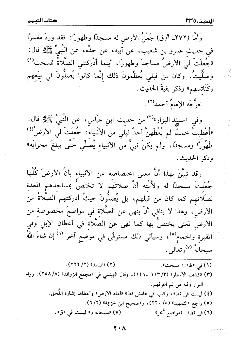 وأما جعل الأرض له مسجدا وطهورا: فقد ورد مفسرا في حديث عمرو بن شعيب، عن أبيه، عن جده، عن النبي - صَلَّى اللهُ عَلَيْهِ وَسَلَّمَ -، قال: ((وجعلت لي الأرض مساجد وطهورا، أينما أدركتني الصلاة تمسحت وصليت، وكان من قبلي يعظمون ذلك؛ إنما كانوا يصلون في بيعهم وكنائسهم)) - وذكر بقية الحديث. خرجه الإمام أحمد.