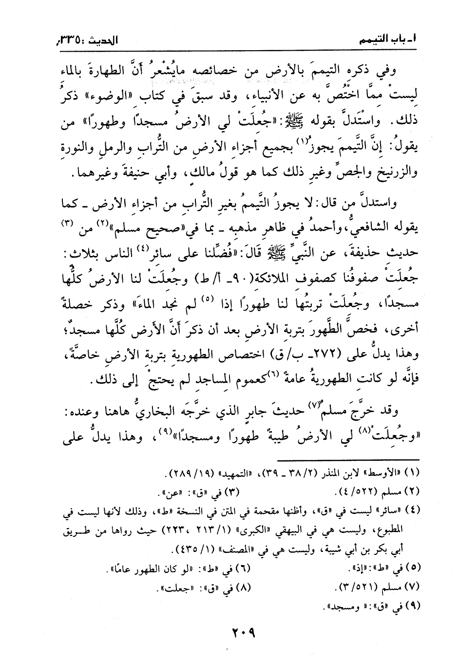 واستدل بقوله - صَلَّى اللهُ عَلَيْهِ وَسَلَّمَ -: ((جعلت لي الأرض مسجدا وطهورا)) من يقول: أن التيمم يجوز بجميع أجزاء الأرض من التراب والرمل والنورة والزرنيخ والجص وغير ذلك، كما هو قول مالك وأبي حنيفة وغيرهما.