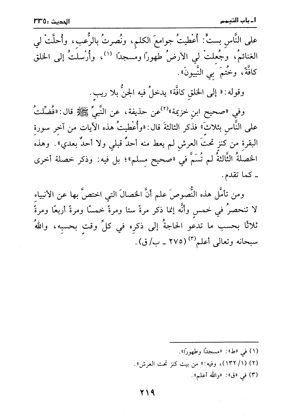 ومن تأمل هذه النصوص علم أن الخصال التي اختص بها عن الأنبياء لا تنحصر في خمس، وأنه إنما ذكر مرة ستا ومرة خمسا ومرة أربعا ومرة ثلاثا بحسب ما تدعو الحاجة إلى ذكره في كل وقت بحسبه. والله أعلم.