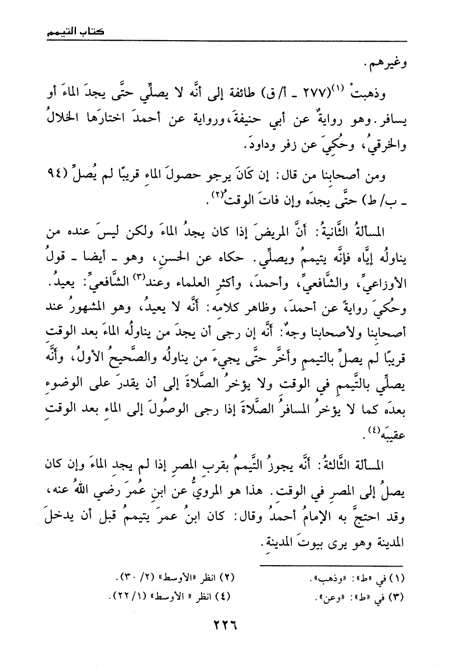 أنه يجوز التيمم بقرب المصر إذا لم يجد الماء، وان كان يصل إلى المصر في الوقت، هذا هو المروي عن ابن عمر - رضي الله عنه -، وقد احتج به الإمام أحمد، وقال: كان ابن عمر يتيمم قبل أن يدخل المدينة، وهو يرى بيوت المدينة.