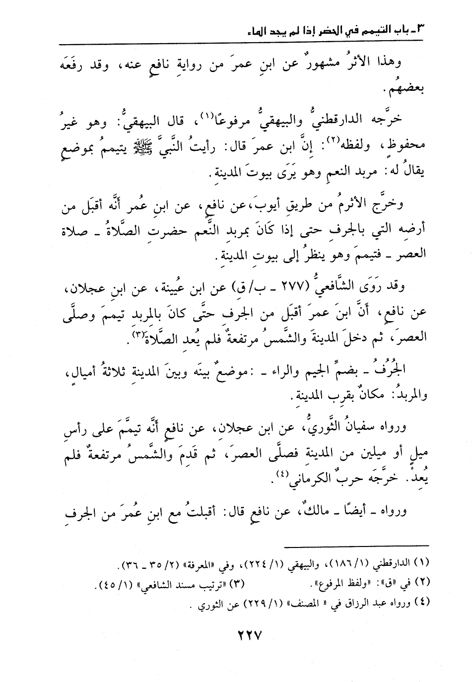 وخرج الأثرم من طريق أيوب، عن نافع، عن ابن عمر، أنه اقبل من أرضه التي بالجرف، حتى إذا كان بمربد النعم حضرت الصلاة صلاة العصر، فتيمم وهو ينظر إلى بيوت المدينة.