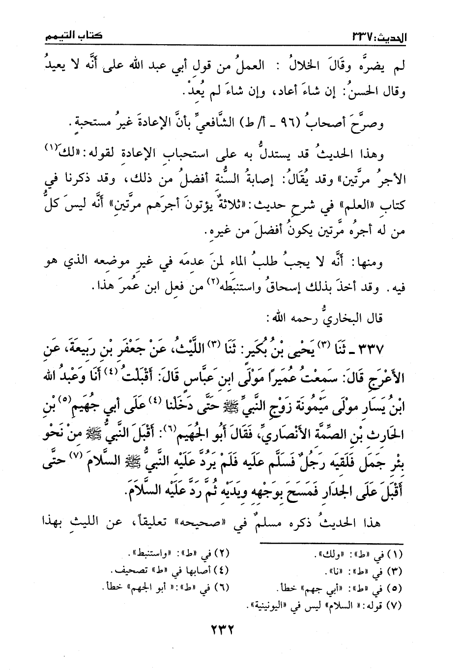 337 - ثنا يحيى بن بُكير: ثنا الليث، عن جعفر بن ربيعة، عن الأعرج، قال: سمعت عُميراً مولى ابن عباس قال: أقبلت أنا وعبد الله بن يسار مولى ميمونة زوج النَّبيّ - صَلَّى اللهُ عَلَيْهِ وَسَلَّمَ -، حتى دخلنا على أبي جهيم بن الحارث بن الصمة الأنصاري، فقال أبو الجهيم: أقبل النبي - صَلَّى اللهُ عَلَيْهِ وَسَلَّمَ - من نحو بئر جمل، فلقيه رجلٌ فسلم عليه، فلم يرد عليه النبي - صَلَّى اللهُ عَلَيْهِ وَسَلَّمَ - السلام، حتى أقبل على الجدار، فمسح بوجهه ويديه، ثم رد عليه السلام.