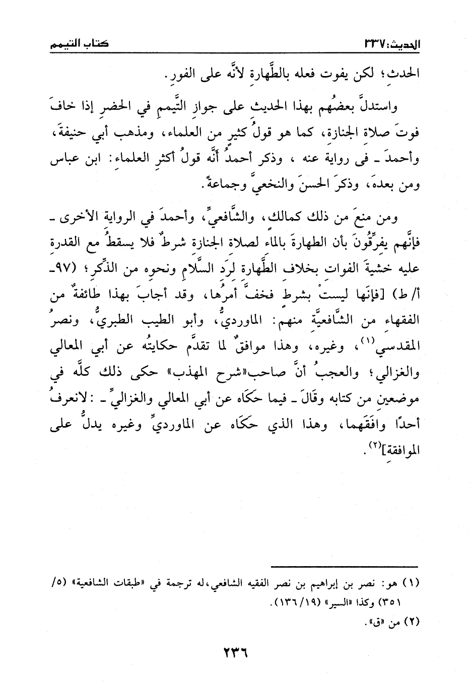 واستدل بعضهم بهذا الحديث: على جواز التيمم في الحضر إذا خاف فوت صلاة الجنازة، كما هو قول كثير من العلماء، ومذهب أبي حنيفة، وأحمد في رواية عنه، وذكر أحمد أنه قول أكثر العلماء: ابن عباس ومن بعده - وذكر الحسن والنخعي وجماعة.