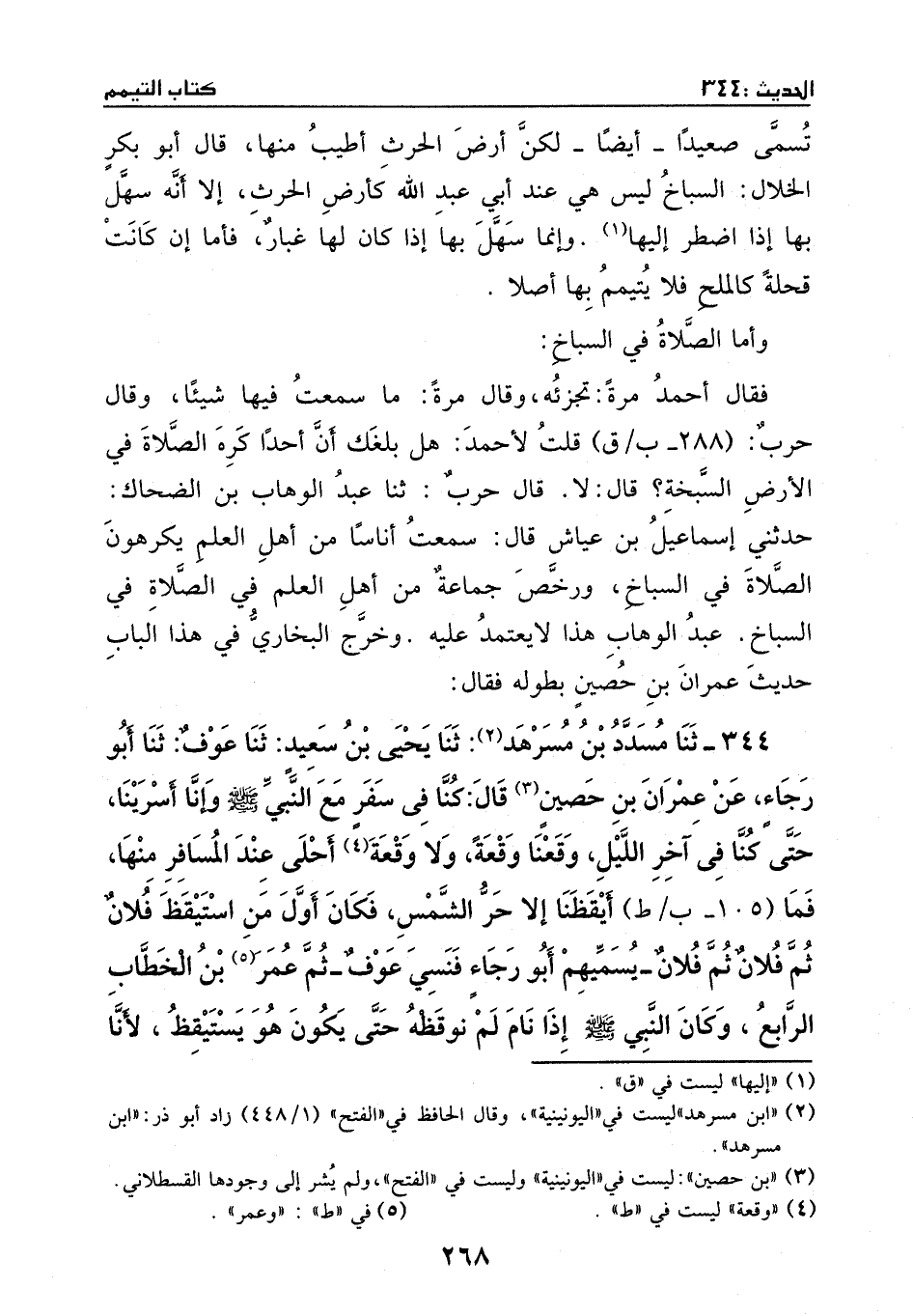 344 - حدثنا مسدد بن مسرهد: ثنا يحيى بن سعيد: ثنا عوف: ثنا أبو رجاء، عن عمران بن حصين، قال: كنا في سفر مع النبي - صَلَّى اللهُ عَلَيْهِ وَسَلَّمَ -، وإنا أسرينا، حتى كنا في آخر الليل وقعنا وقعة، ولا وقعة أحلى عند المسافر منها، فما أيقظنا إلا حر الشمس، فكان أول من استيقظ فلان ثم فلان ثم فلان - يسميهم أبو رجاء، فنسي عوف -، ثم عمر بن الخطاب الرابع، وكان النبي - صَلَّى اللهُ عَلَيْهِ وَسَلَّمَ - إذا نام لم نوقظه حتى يكون هو يستيقظ؛ لأنا