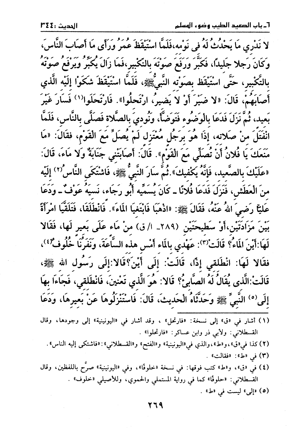 ثم نزل فدعا بالوضوء فتوضأ، ونودي بالصلاة، فصلى بالناس، فلما انفتل من صلاته إذا هو برجل معتزل لم يصل مع القوم، فقال: ((ما منعك يا فلان أن تصلي مع القوم؟)) قال: أصابتني جنابة، ولا ماء، قال: ((عليك بالصعيد؛ فإنه يكفيك)) ، ثم سار النبي - صَلَّى اللهُ عَلَيْهِ وَسَلَّمَ -، فاشتكى الناس إليه من العطش، فنزل فدعا فلانا - كان يسميه أبو رجاء، نسيه عوف -، ودعا عليا، فقال: ((أذهبا فابتغيا الماء)) فانطلقا فتلقيا امرأة بين مزادتين - أو سطيحتين - من ماء على بعير لها، فقالا لها: أين الماء؟ قالت: عهدي بالماء أمس هذه الساعة، ونفرنا خلوفا، فقالا لها: انطلقي إذا، قالت: إلى أين؟ قالا: إلى رسول الله - صَلَّى اللهُ عَلَيْهِ وَسَلَّمَ - قالت: الذي يقال له الصابئ؟ قالا: هو الذي تعنين، فانطلقي، فجاءا بها إلى النبي - صَلَّى اللهُ عَلَيْهِ وَسَلَّمَ -، وحدثاه الحديث، قال: فاستنزلوها عن بعيرها، ودعا