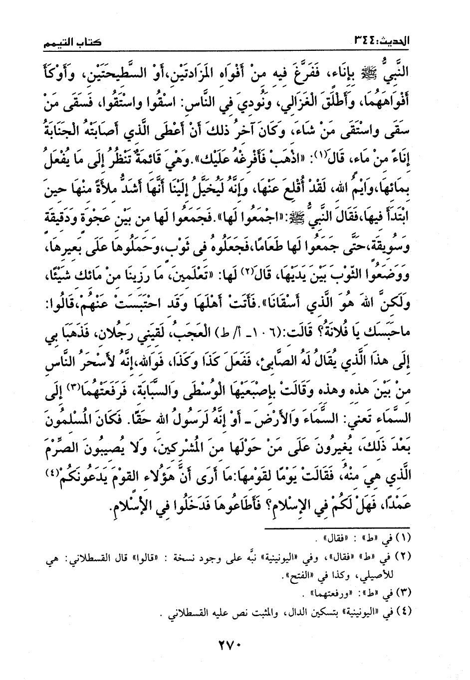النبي - صَلَّى اللهُ عَلَيْهِ وَسَلَّمَ - بإناء، ففرغ فيه من أفواه المزادتين - أو السطيحتين -، وأوكأ أفواهمها، وأطلق العزالي، ونودي في الناس: اسقوا واستقوا، فسقى من سقى، واستقى من شاء، وكان آخر ذلك أن أعطى الذي أصابته الجنابة إناء من ماء، قال: ((اذهب فأفرغه عليك)) . وهي قائمة تنظر إلى ما يفعل بمائها، وايم الله، لقد اقلع عنها وإنه ليخيل إلينا أنها أشد ملأة منها حين ابتدأ فيها، فقال النبي - صَلَّى اللهُ عَلَيْهِ وَسَلَّمَ -: ((اجمعوا لها)) ، فجمعوا لها من بين عجوة ودقيقة وسويقة، حتى جمعوا لها طعاما فجعلوه في ثوب، وحملوها على بعيرها، ووضعوا الثوب بين يديها.