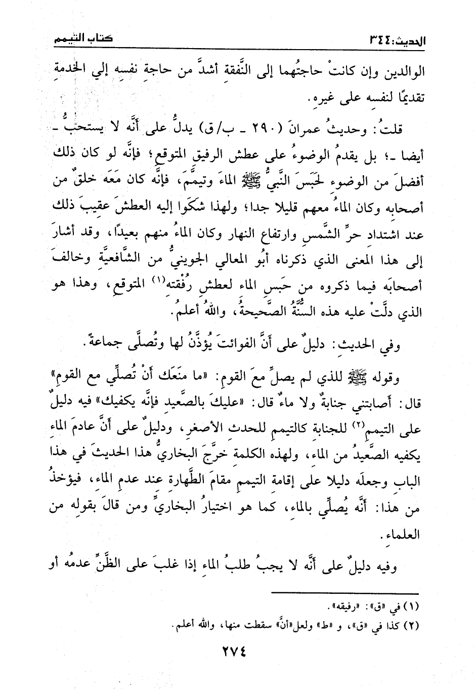 قلت: وحديث عمران يدل على أنه لا يستحب - أيضا - بل يقدم الوضوء على عطش الرفيق المتوقع، فإنه لو كان ذلك أفضل من الوضوء لحبس النبي - صَلَّى اللهُ عَلَيْهِ وَسَلَّمَ - الماء وتيمم، فإنه كان معه خلق من أصحابه، وكان الماء معهم قليلا جدا ولهذا شكوا إليه العطش عقيب ذلك عند اشتداد حر الشمس وارتفاع النهار، وكان الماء منهم بعيدا.