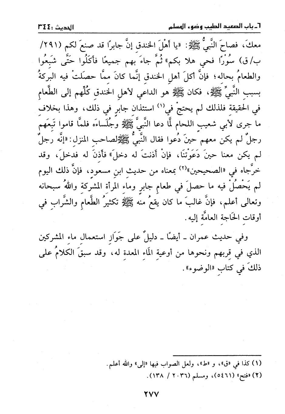 وقد خرجاه في ((الصحيحين)) بمعناه من حديث أبي مسعود، فإن ذلك اليوم لم يحصل فيه ما حصل في طعام جابر وماء المرآة المشركة – والله - سبحانه وتعالى - أعلم -، فإن غالب ما كان يقع منه - صَلَّى اللهُ عَلَيْهِ وَسَلَّمَ - تكثير الطعام والشراب في أوقات الحاجة العامة إليه.