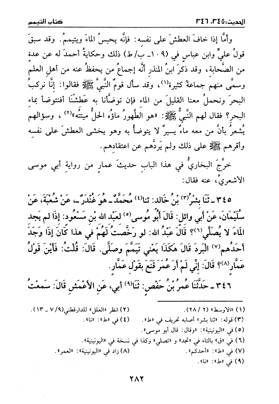 345 - ثنا بشر بن خالد: ثنا محمد - هو: غندر -، عن شعبة، عن سليمان، عن أبي وائل: قال أبو موسى لعبد الله بن مسعود: إذا لم تجد الماء لا تصلي؟ قال عبد الله: لو رخصت لهم في هذا، كان إذا وجد أحدهم البرد قال هكذا - يعني: تيمم - وصلى. قال: قلت فأين قول عمار لعمر؟ قال: إني لم أرى عمر قنع بقول عمار.