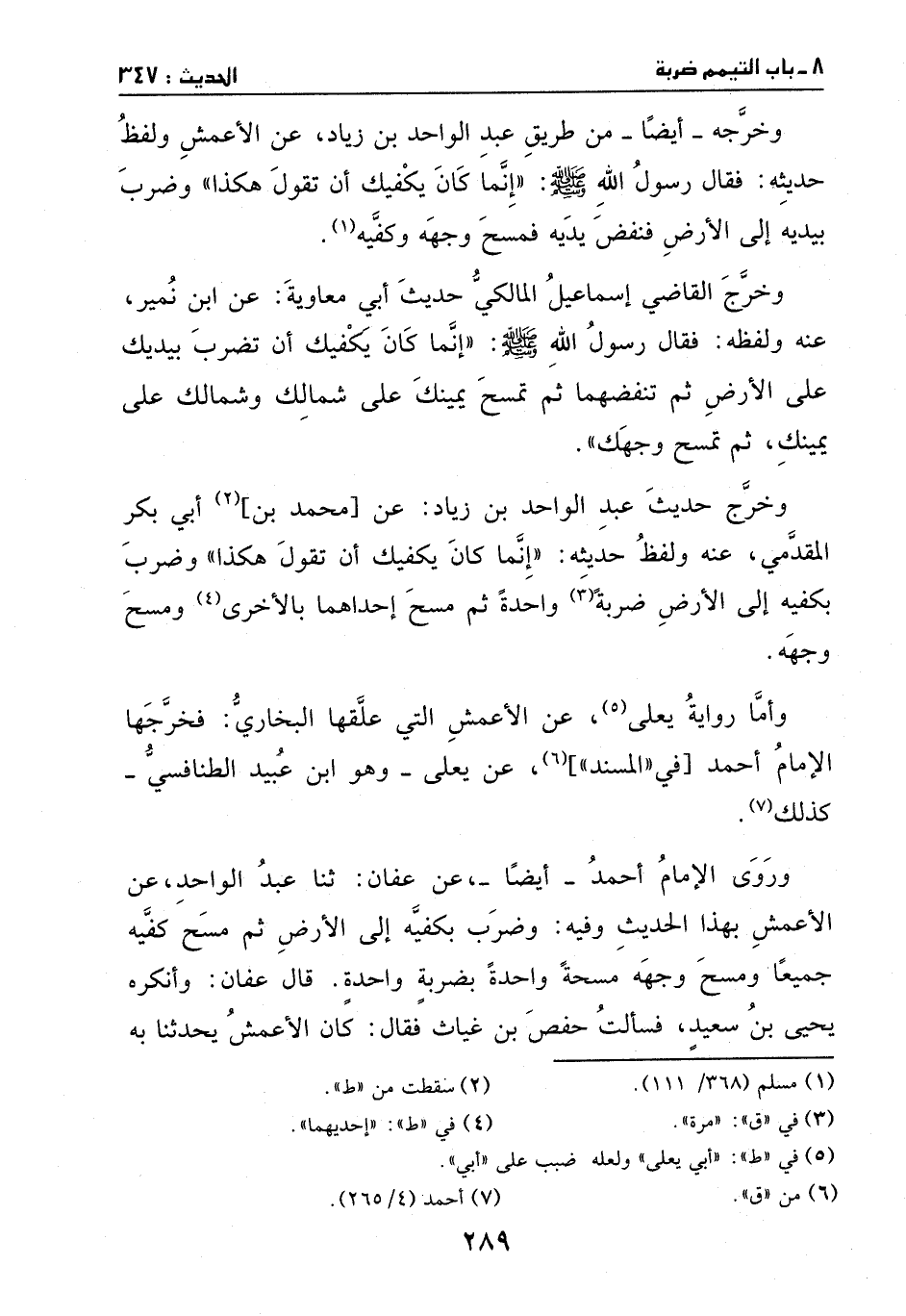 وخرج القاضي إسماعيل المالكي حديث أبي معاوية، عن ابن نمير، عنه، ولفظه: فقال رسول الله - صَلَّى اللهُ عَلَيْهِ وَسَلَّمَ -: ((إنما كان يكفيك أن تضرب بيديك على الأرض، ثم تنفضهما، ثم تمسح يمينك على شمالك وشمالك على يمينك، ثم تمسح وجهك)) .