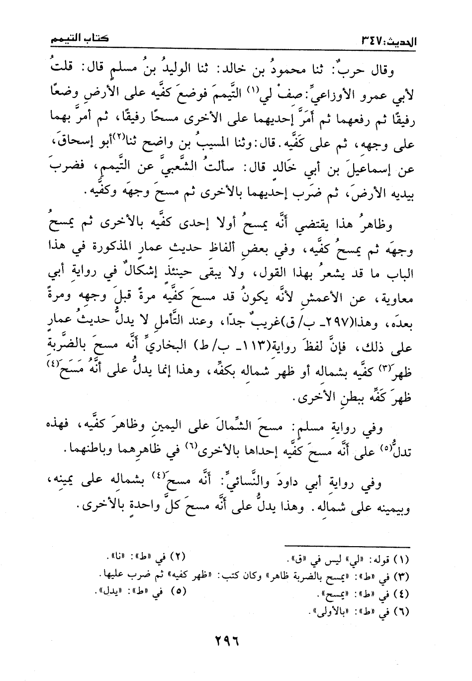 وقال حرب: ثنا محمود بن خالد: ثنا الوليد بن مسلم، قال: قلت لأبي عمرو الأوزاعي: صف التيمم؟ فوضع كفيه على الأرض وضعا رفيقا، ثم رفعهما، ثم أمر إحداهما على الأخرى مسحا رفيقا، ثم أمر بهما على وجهه، ثم على كفيه.