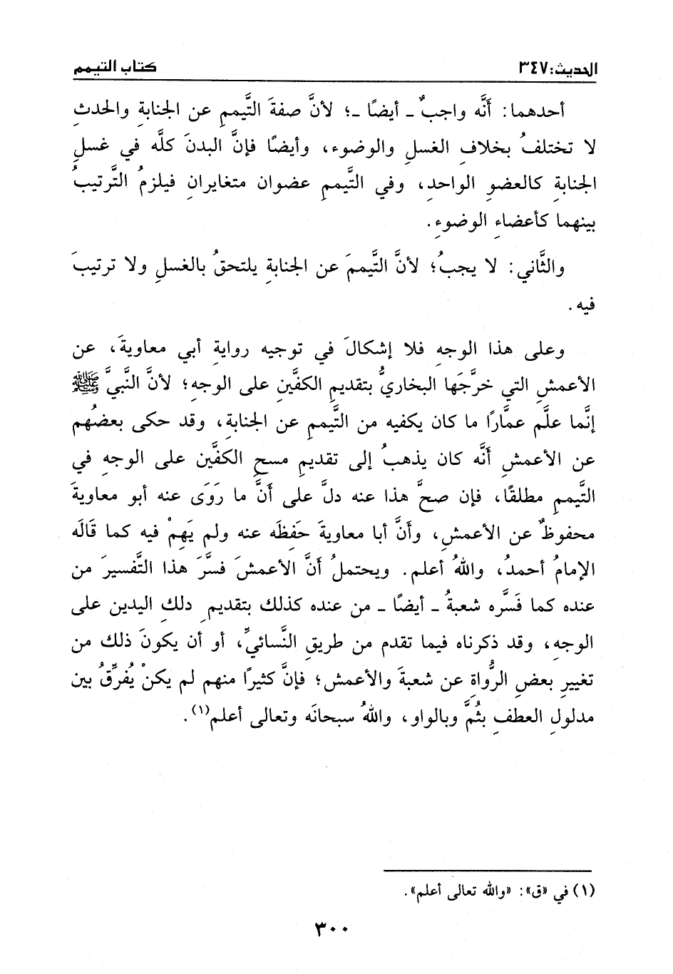 ويحتمل أن الأعمش فسر هذا التفسير من عنده كما فسره شعبة - أيضا - من عنده كذلك بتقديم دلك اليدين على الوجه، وقد ذكرناه فيما تقدم من طريق النسائي، أو أن يكون ذلك من تفسير بعض الرواة عن شعبة والأعمش؛ فإن كثيرا منهم لم يكن يفرق بين مدلول العطف بـ ((ثُمَّ)) وبالواو. والله تعالى أعلم.