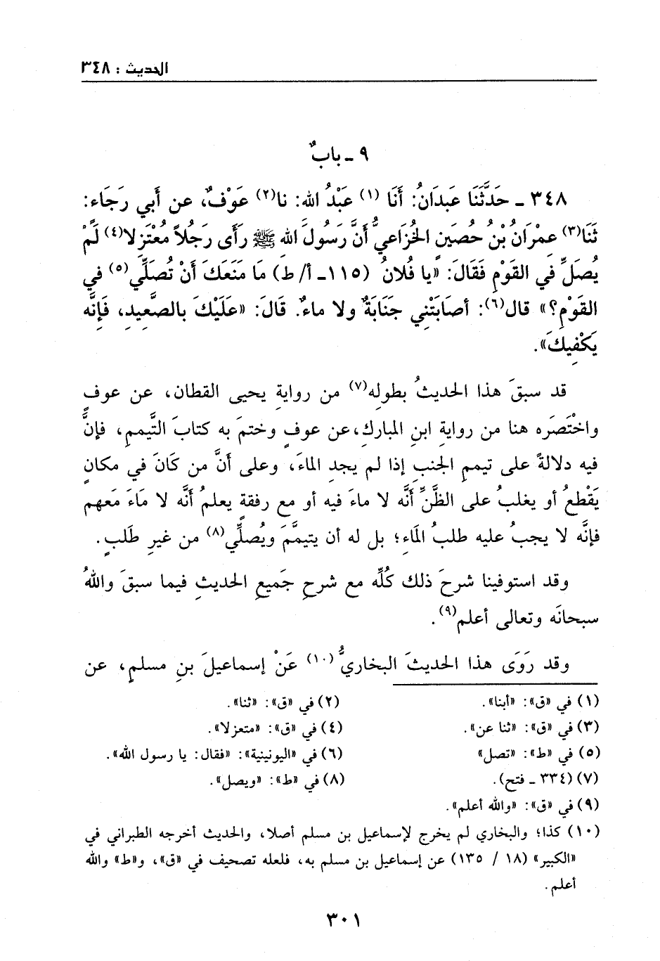 348 - حدثنا عبدان: أبنا عبد الله: ثنا عوف، عن أبي رجاء: ثنا عمران بن حصين الخزاعي، أن رسول الله - صَلَّى اللهُ عَلَيْهِ وَسَلَّمَ - رأى رجلا معتزلا لم يصل في القوم، فقال: