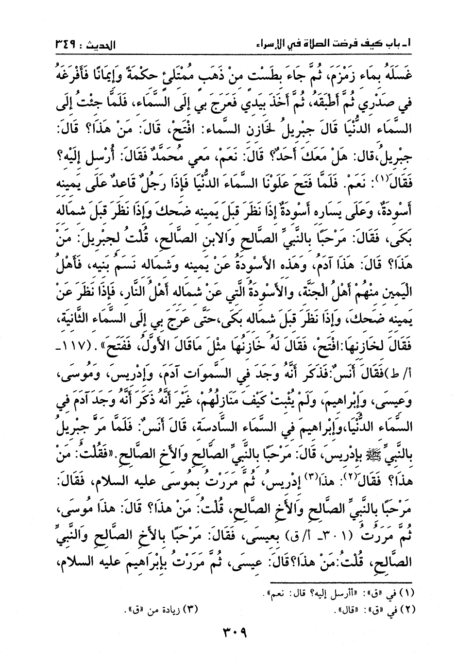 غسله بماء زمزم، ثم جاء بطست من ذهب ممتلئ حكمة وإيمانا، فأفرغه في صدري، ثم أطبقه، ثم اخذ بيدي فعرج إلى السماء، فلما جئت إلى السماء الدنيا قال جبريل لخازن السماء: افتح، قال: من هذا؟ قَالَ: جبريل، قَالَ: هَلْ معك احد؟ قال: نعم، معي محمد. فقال: أرسل إليه؟ قال: نعم، فلما فتح علونا السماء الدنيا، فإذا رجل قاعد على يمينه أسودة، وعلى يساره اسودة، إذا نظر قبل يمينه ضحك، وإذا نظر قبل شماله بكى، فقال: مرحبا بالنبي الصالح والابن الصالح. قلت لجبريل: من هذا؟ قال: هذا ادم، وهذه الاسودة عن يمينه وشماله نسم بنيه، فأهل اليمين منهم أهل الجنة، والاسودة التي عن شماله أهل النار، فإذا نظر عن يمينه ضحك، وإذا نظر قبل شماله بكى. حتى عرج بي إلى السماء الثانية، فقال لخازنها:
