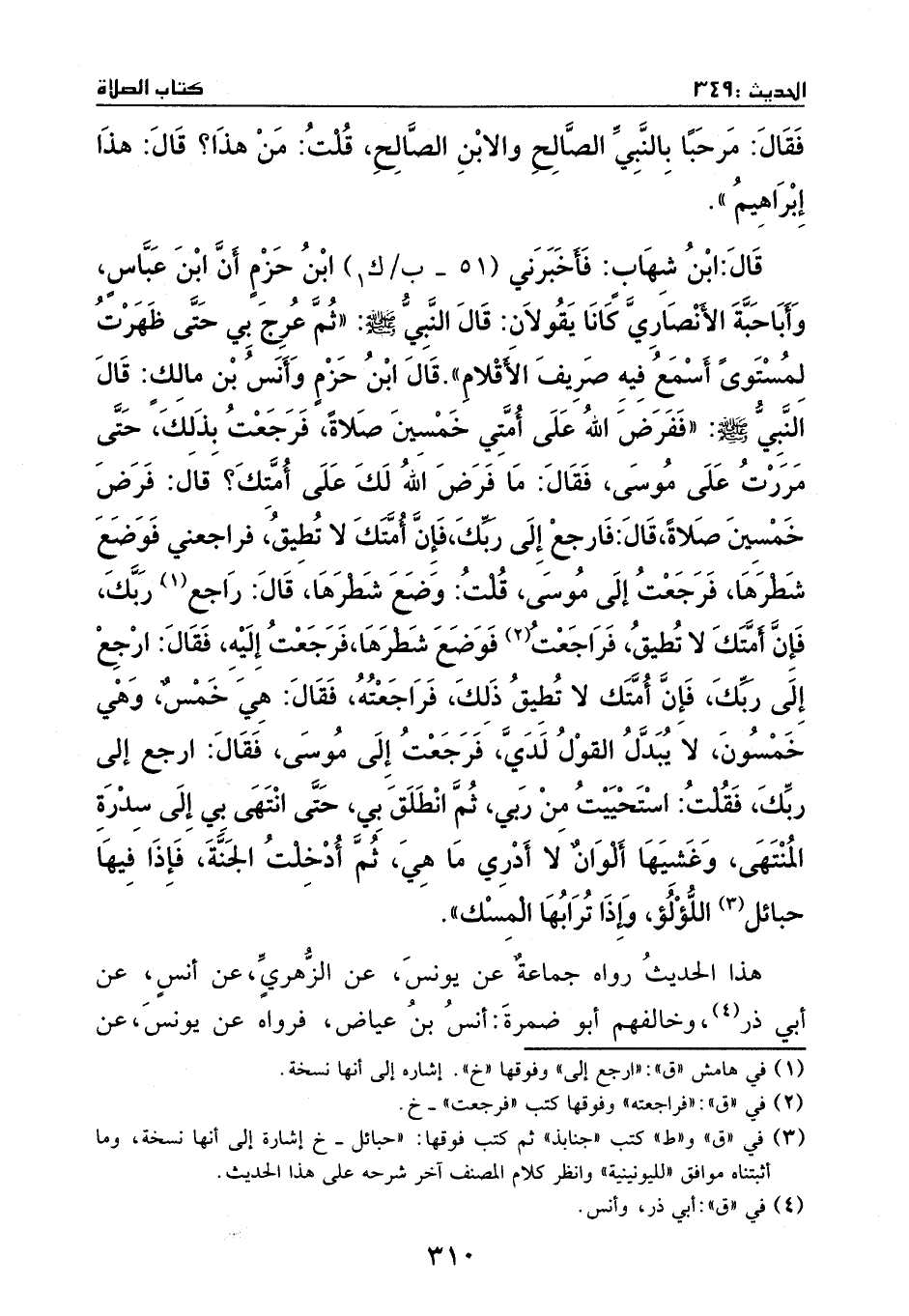 قال ابن حزم وانس بن مالك: قال النبي - صَلَّى اللهُ عَلَيْهِ وَسَلَّمَ -: ((ففرض الله على أمتي خمسين صلاة، فرجعت بذلك حتى مررت على موسى، فقال: ما فرض الله لك على أمتك؟ قلت: فرض خمسين صلاة، قال: فارجع إلى ربك، فإن أمتك لا تطيق، فراجعني فوضع شطرها، فرجعت إلى موسى، قلت: وضع شطرها، قال: راجع ربك، فإن أمتك لا تطيق، فراجعت فوضع شطرها، فرجعت إليه، فقال: ارجع إلى ربك؛ فإن أمتك لا تطيق ذلك، فراجعته، فقال: هي خمس، وهي خمسون، لا يبدل القول لدي، فرجعت إلى موسى، فقال: أرجع إلى ربك، فقلت: استحييت من ربي، ثم انطلق بي حتى انتهى بي إلى سدرة المنتهى، وغشيها ألوان لا ادري ما هي، ثم أدخلت الجنة، فإذا فيها جنابذ اللؤلؤ، وإذا ترابها المسك)) .