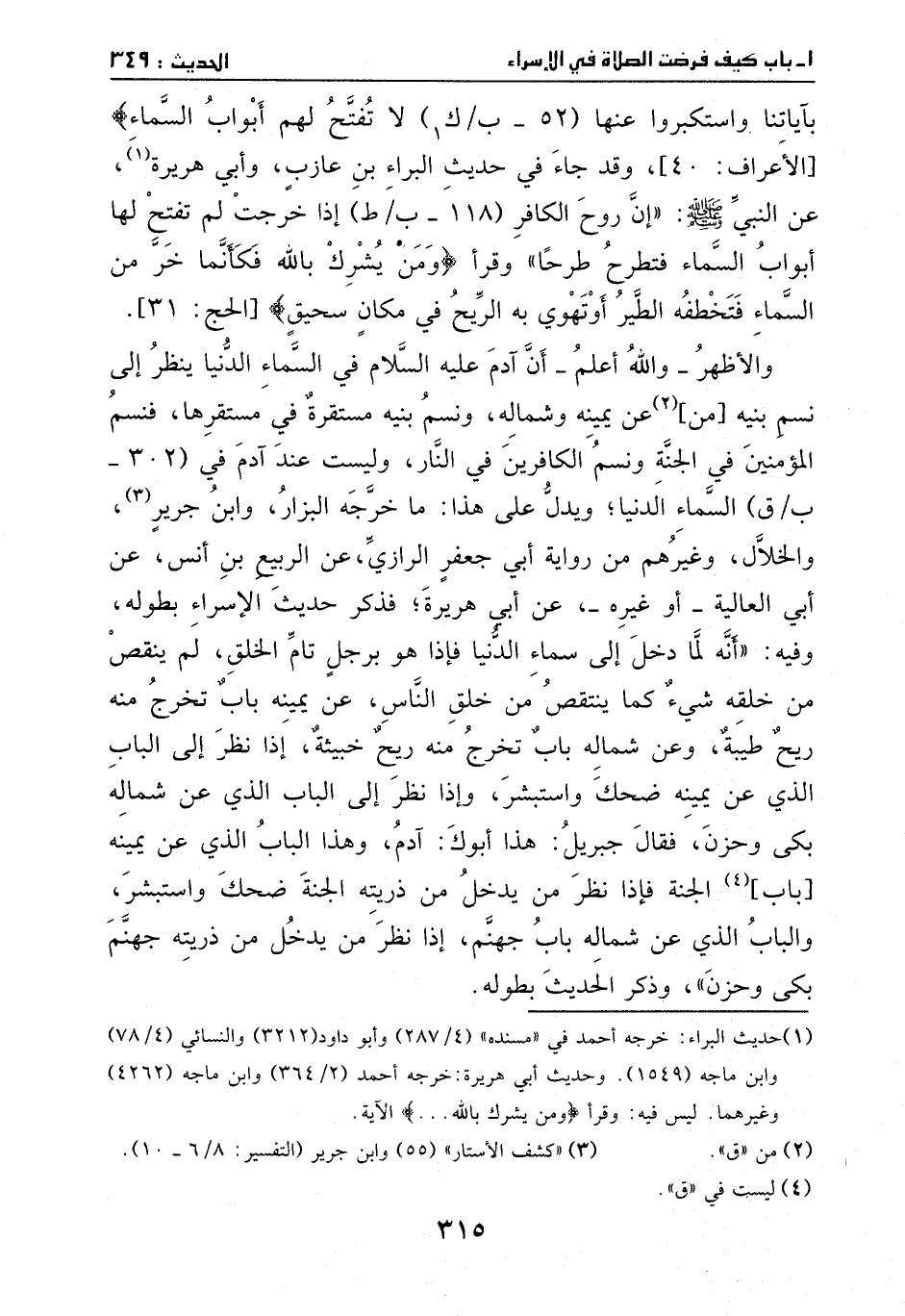 ويدل على هذا: ما خرجه البزار وابن جرير والخلال وغيرهم من رواية أبي جعفر الرازي، عن الربيع بن أنس، عن أبي العالية أو غيره، عن أبي هريرة، فذكر فذكر حديث الإسراء بطوله، وفيه: أنه لما دخل إلى سماء الدنيا فإذا هو برجل تام الخلق، لم ينقص من خلقه شئ كما ينتقص من خلق الناس، عن يمينه باب يخرج منه ريح طيبة، وعن شماله باب يخرج منه ريح خبيثة، إذا نظر إلى الباب الذي عن يمينه ضحك واستبشر، وإذا نظر إلى الباب الذي عن شماله بكى وحزن، فقال جبريل: هذا أبوك آدم، وهذا الباب الذي عن يمينه الجنة، فإذا نظر من يدخل من ذريته الجنة ضحك واستبشر، والباب الذي عن شماله باب جهنم، إذا نظر من يدخل من ذريته جهنم بكى وحزن - وذكر الحديث بطوله.