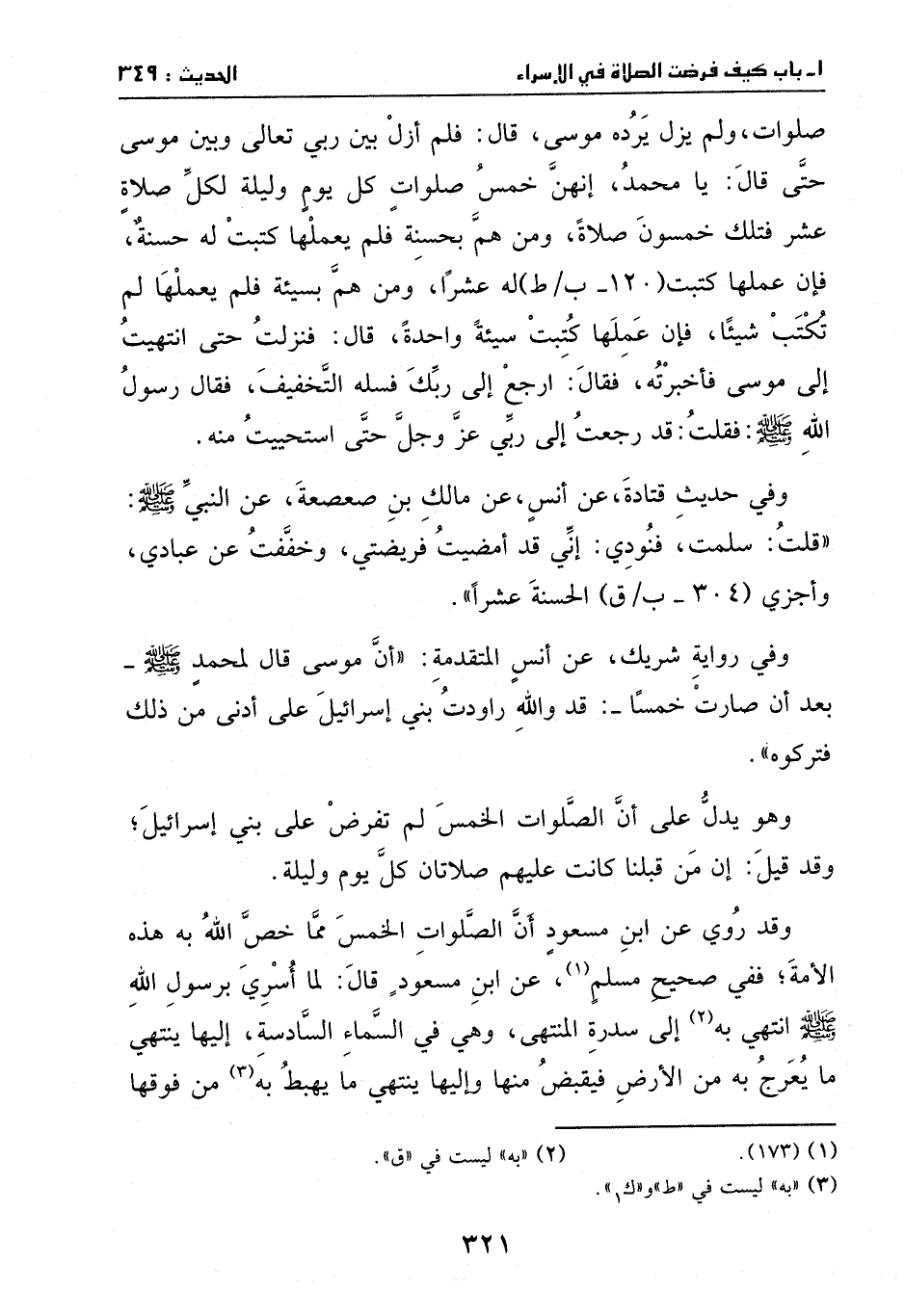 وفي حديث قتادة، عن أنس، عن مالك بن صعصعة، عن النبي - صَلَّى اللهُ عَلَيْهِ وَسَلَّمَ -: ((قلت: سلمت، فنودي أني قد أمضيت فريضتي، وخففت عن عبادي، وأجزي الحسنة
