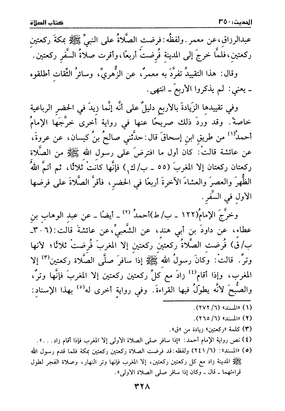 وقد ورد ذلك صريحا عنها في رواية أخرى خرجها الإمام أحمد من طريق ابن إسحاق، قال: حدثني صالح بن كيسان، عن عروة، عن عائشة، قالت: كان أول ما افترض على رسول الله - صَلَّى اللهُ عَلَيْهِ وَسَلَّمَ - من الصلاة ركعتان ركعتان، إلا المغرب فإنها كانت ثلاثا، ثم أتم الله الظهر والعصر والعشاء الآخرة أربعاً في الحضر، فأقر الصلاة على فرضها الأول في السفر.