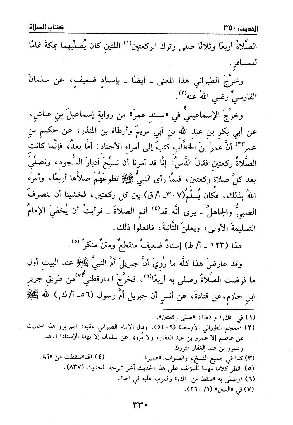 وخرج الإسماعيلي في ((مسند عمر)) من رواية إسماعيل بن عياش، عن أبي بكر بن عبد الله بن أبي مريم وأرطاة بن المنذر، عن حكيم بن عمير، أن عمر بن الخطاب كتب إلى أمراء الأجناد: أما بعد، فإنما كانت الصلاة أول الإسلام ركعتين، فقال الناس: إنا قد امرنا أن نسبح أدبار السجود ونصلي بعد كل صلاة ركعتين، فلما رأى النبي - صَلَّى اللهُ عَلَيْهِ وَسَلَّمَ - تطوعهم صلاها أربعاً، وأمرهُ الله بذلك، فكان يسلم بين كل ركعتين، فخشينا أن ينصرف الصبي والجاهل يرى أنه قد أتم الصلاة، فرأيت أن يخفي الإمام التسليمة الأولى ويعلن بالثانية، فافعلوا ذلك.