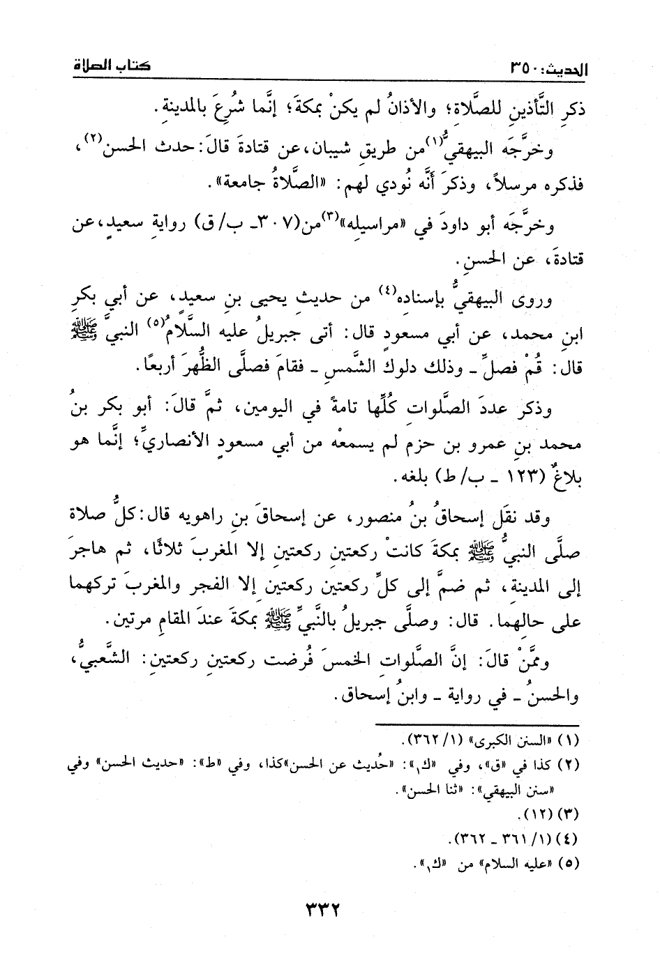 وروى البيهقي باسنادة من حديث يحيى بن سعيد، عن أبي بكر بن محمد، عن أبي مسعود، قال: أتى جبريل النبي - صَلَّى اللهُ عَلَيْهِ وَسَلَّمَ -، قال: قم فصل؛ وذلك دلوك الشمس، فقام فصلى الظهر أربعاً - وذكر عدد الصلوات كلها تامة في اليومين.