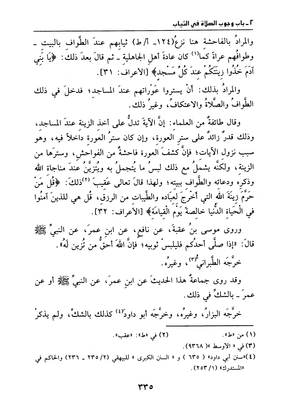 وروى موسى بن عقبة، عن نافع، عن ابن عمر، عن النبي - صَلَّى اللهُ عَلَيْهِ وَسَلَّمَ -، قال: ((إذا صلى أحدكم فليلبس ثوبيه، فإن الله أحق من تزين له)) .