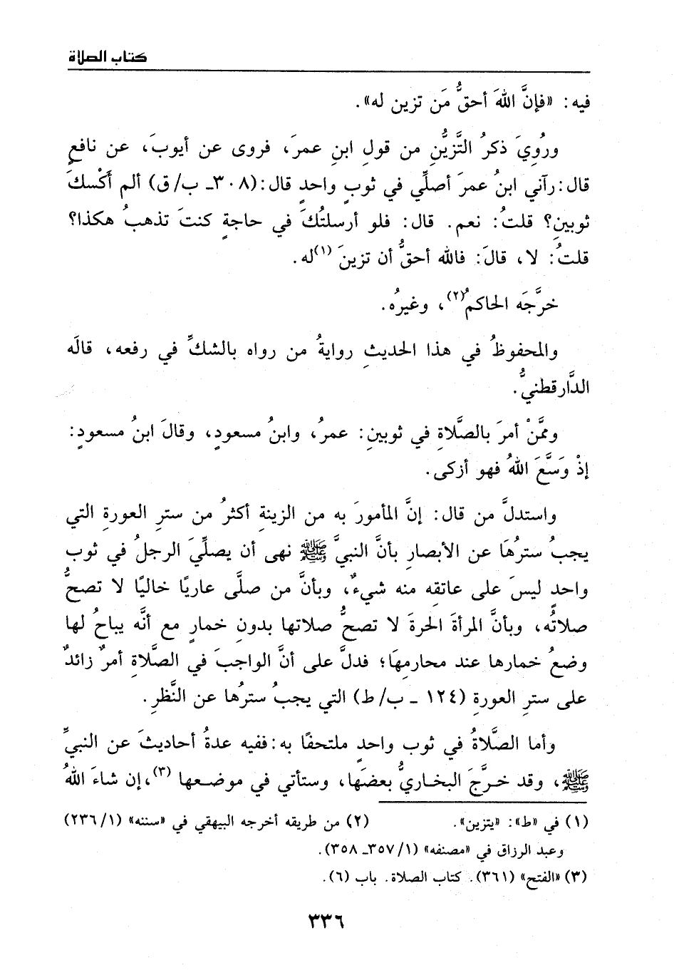 واستدل من قال: أن المأمور به من الزينة أكثر من ستر العورة التي يجب سترها عن الأبصار بأن النبي - صَلَّى اللهُ عَلَيْهِ وَسَلَّمَ - نهى أن يصلي الرجل في ثوب واحد ليس على عاتقه منه شيء، وبان من صلى عاريا خاليا لا تصح صلاته، وبان المرآة الحرة لا تصح صلاتها بدون خمار، مع أنه يباح لها وضع خمارها عند محارمها، فدل على أن الواجب في الصلاة أمر زائد على ستر العورة التي يجب سترها عن النظر.