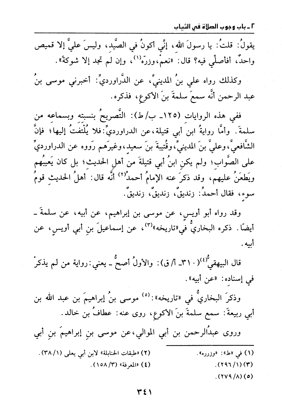 يقول: قلت: يا رسول الله، أني أكون في الصيد، وليس علي إلاّ قميص واحد، أفأصلي فيه؟ قال ((نعم، وزره وان لم تجد إلا شوكه)) .