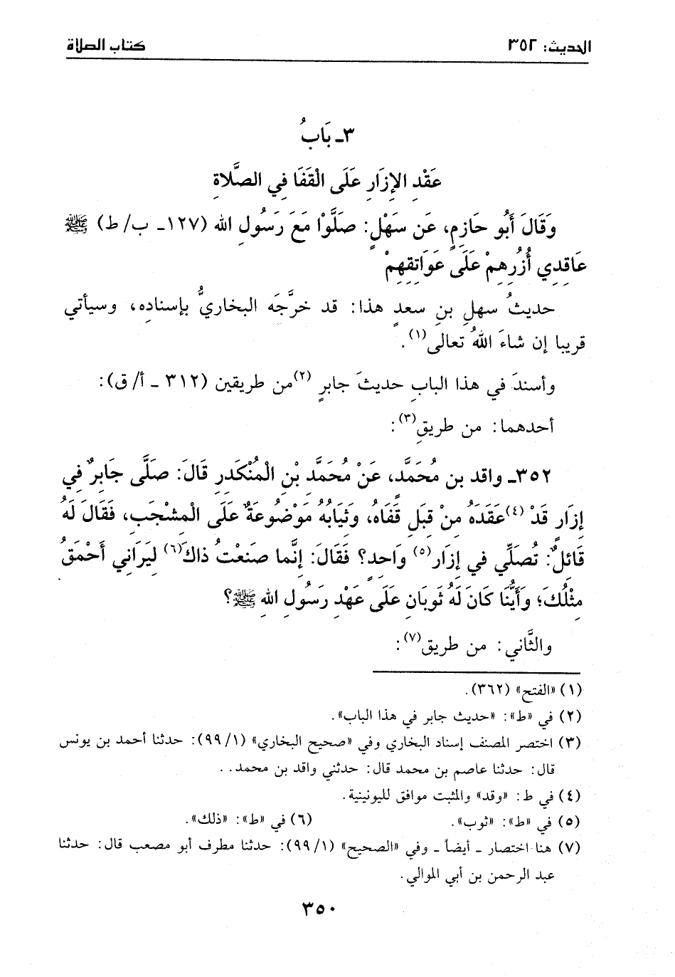 352 - من طريق: واقد بن محمد، عن محمد بن المنكدر، قال: صلى جابر في إزار، قد عقده من قبل قفاه، وثيابه موضوعة على المشجب، فقال له قائل: تصلي في إزار واحد؟ قال: إنما صنعت ذلك ليراني أحمق مثلك، وأينا كان له ثوبان على عهد رسول الله - صَلَّى اللهُ عَلَيْهِ وَسَلَّمَ -؟!