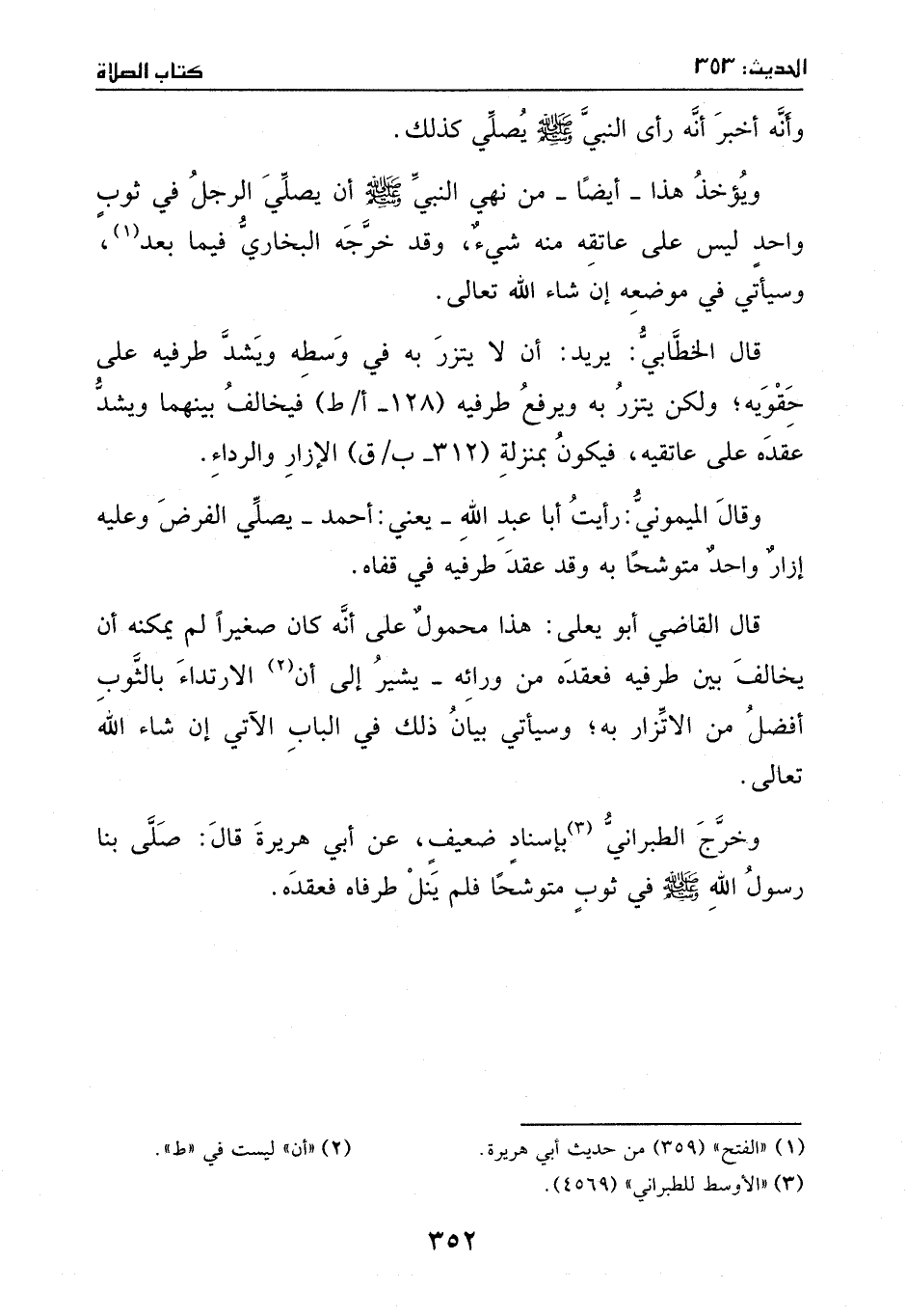 وخرج الطبراني بإسناد ضعيف، عن أبي هريرة، قال: صلى بنا رسول الله - صَلَّى اللهُ عَلَيْهِ وَسَلَّمَ - في ثوب متوشحا، فلم ينل طرفاه، فعقده.